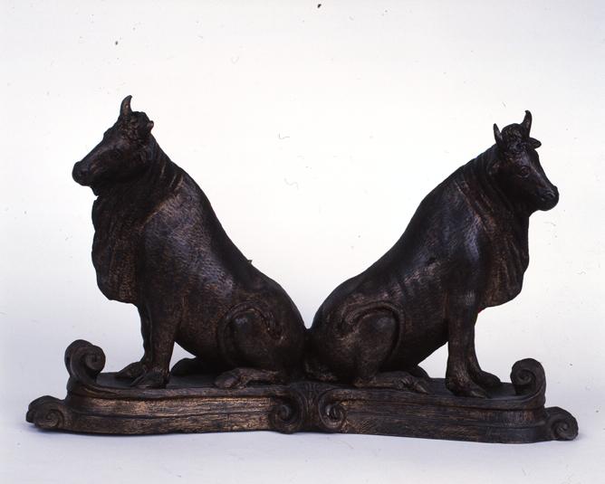 Alare costituito da una coppia di buoi seduti e accostati da tergo, posizionati su base bronzea sagomata, fusa senza soluzione di continuità e decorata con motivi a voluta