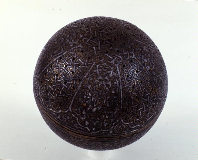 Sfera bruciaprofumi a due valve, decorata da registri simmetrici, con motivi a cartigli oblunghi, alternati a motivi vegetali stilizzati, desinenti in foglie trilobate e fiori stilizzati; ai poli, medaglioni con decorazione geometrica di tipo stellare; fascia mediana. Sul fondo, decorazione ad arabeschi minuti