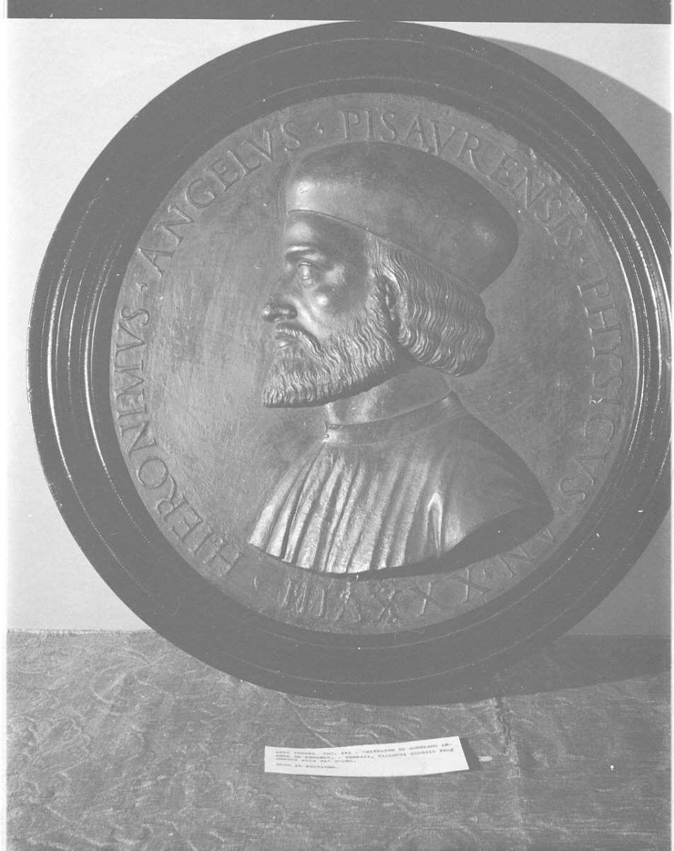 - NOTIZIE STORICO CRITICHE In pendant con il rilievo Br. 192. Provenienza: Murano, chiesa di San Pietro Martire; Accademia di Belle Arti di Venezia, ante 1815; Reale Museo Archeologico con sede in Palazzo Ducale, ca. 1895; depositato presso la Galleria Giorgio Franchetti alla Ca’ d’Oro, ca. 1926. Si tratta di un tondo fuso in bronzo, che raffigura il busto del medico Girolamo Angeli da Pesaro di Agostino, morto nel 1527, all’età di 38 anni. I rilievi (Br. 192, 193) facevano parte del monumento sepolcrale eretto dagli eredi di Agostino Angeli nella chiesa di San Pietro Martire di Murano; dalla descrizione del Colucci (1790) sappiamo che doveva trattarsi di un’urna sostenuta da quattro colonne, collocata sulla destra dell’ingresso principale, che in seguito alla soppressione della chiesa (1806) e alla sua successiva riapertura al culto come parrochiale (1813) venne modificata e coperta dal basamento dell’attuale organo. L’esecuzione del monumento sepolcrale va fissata dopo la morte di Agostino e prima della scomparsa di Girolamo, poiché, come si deduce dall’epigrafe, già riportata da Moschini (1815, II/2, p. 412), i quattro figli, tra i quali lo stesso Girolamo, compaiono come dedicatori dell’epitaffio del padre. Di qualche anno successivi devono essere invece l’iscrizione e il tondo dedicati alla memoria di Girolamo, prematuramente scomparso quattro anni dopo il padre