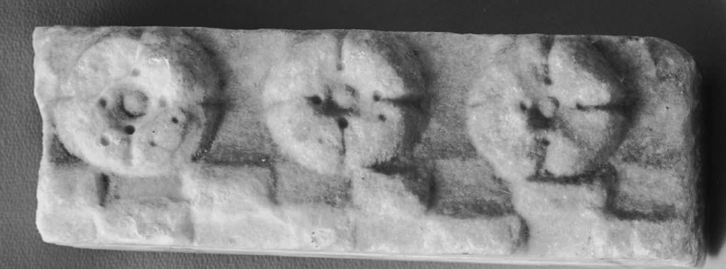 Frammento di cornice decorato in rilievo a dentelli, nella parte inferiore, e rosette, nella parte centrale. Nel verso cornici sagomate pluriprofilate classiche