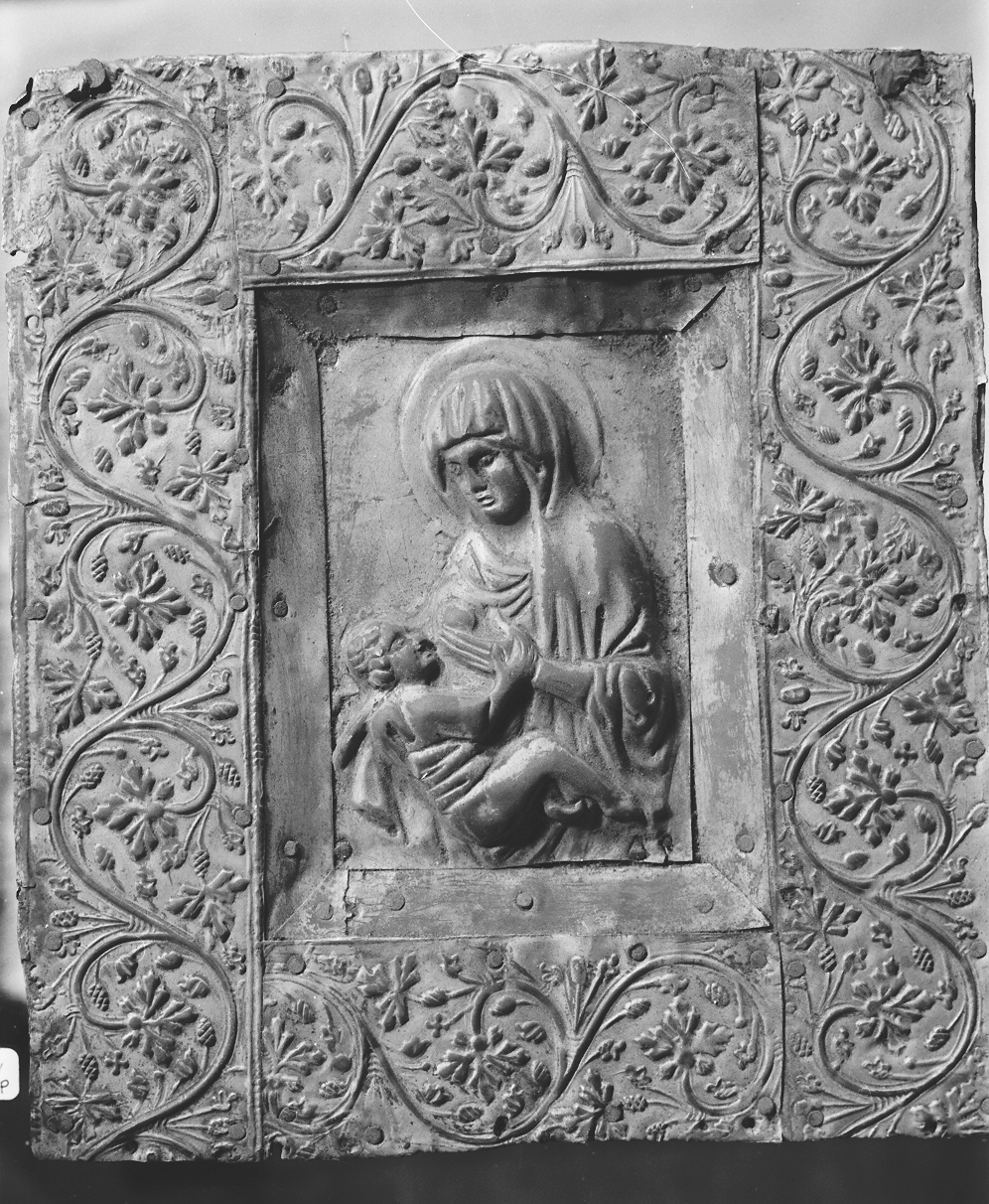 La Madonna ed il Bambino sono raffigurati all'interno di una cornice a girali desinenti in motivi fitomorfi stilizzati. Lamina di rame sbalzato su supporto ligneo