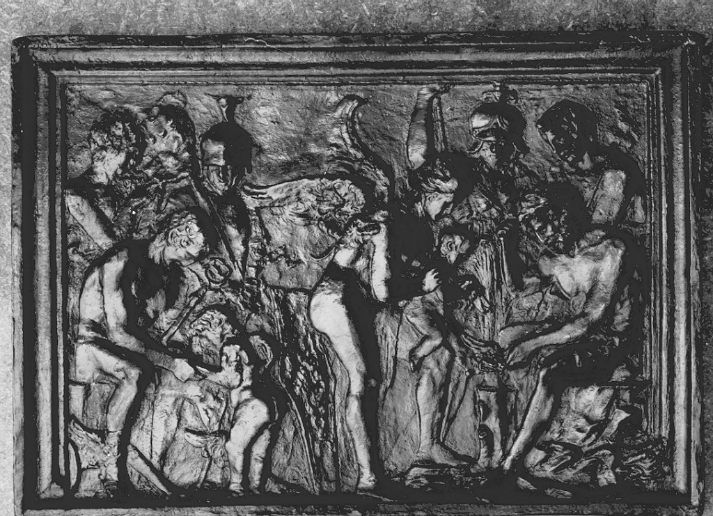 - NOTIZIE STORICO CRITICHE Provenienza: Padova, coll. monastero dei canonici regolari lateranensi di San Giovanni di Verdara, 1783; trasferito nella Biblioteca Marciana; quindi nel Reale Museo Archeologico di Venezia con sede in Palazzo Ducale, ca. 1895; depositato presso la Galleria Giorgio Franchetti alla Ca’ d’Oro, ca. 1926. Esemplari simili: Londra, Victoria and Albert Museum; Firenze, Museo Bardini. Sull'attribuzione del rilievo la critica è divisa in due gruppi: alcuni lo collegano a Bertoldo di Giovanni, altri a Vittore Gambello, detto Camelio. Sono della prima opinione Planiscig (1927) e le guide di Ca’ d’Oro (Fogolari, Nebbia, Moschini 1929; Fogolari 1936; Valcanover 1986; Moschini Marconi 1992; Augusti, Saccardo 2002). Invece Pope-Hennessy (1963) – sulla base di un’attribuzione proposta per la variante londinese del bronzetto (Bronzetti italiani 1962, n. 86) – lega il modello al nome di Vittore Gambello, rifacendosi alla primitiva intuizione di Paoletti (1893); ipotesi peraltro condivisa da Jacobsen (1972) e dal catalogo della mostra di Francoforte (Natur und Antike 1985)