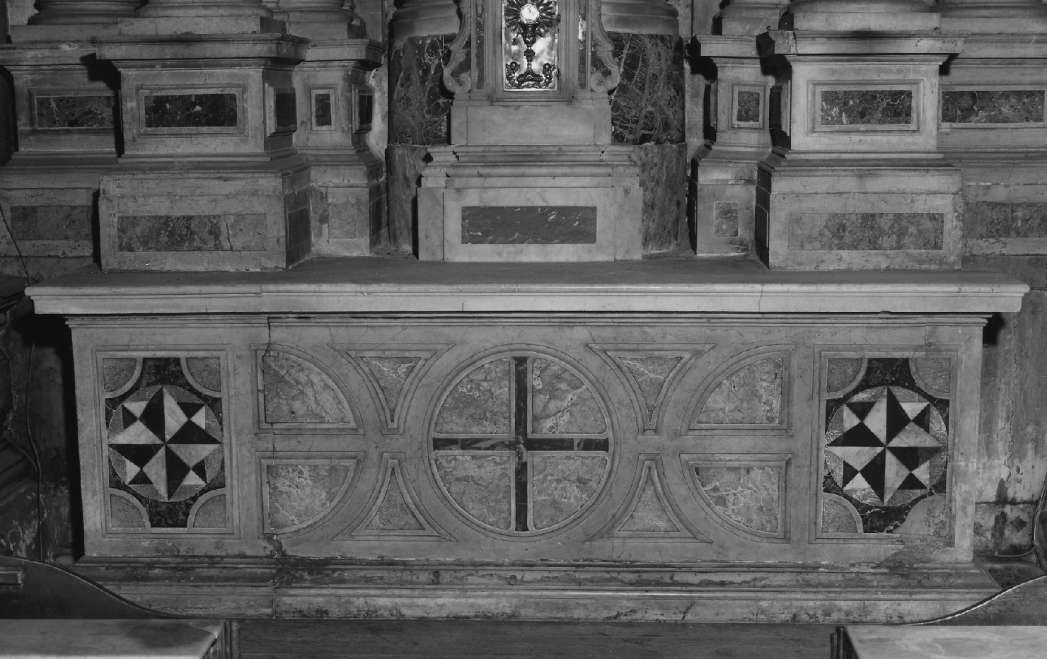 DOSSALE FISSO DECORATO DA INTARSI DI MARMI COLORATI CHE FORMANO MOTIVI GEOMETRICI. AI DUE LATI INTARSI IN MARMO ROSSO E NERO SU FONDO BIANCO CHE FORMANO UN ROSONE INSCRITTO IN UN CERCHIO A SUA VOLTA POSTO ALL'INTERNO SU UN MOTIVO MISTILINEO. AL CENTRO PANNELLO CON MOTIVI CIRCOLARI IN MARMO ROSSO. NEL CERCHIO CENTRALE MOTIVO A CROCE IN MARMO ROSSO. BORDATURA IN PIETRA D' ISTRIA