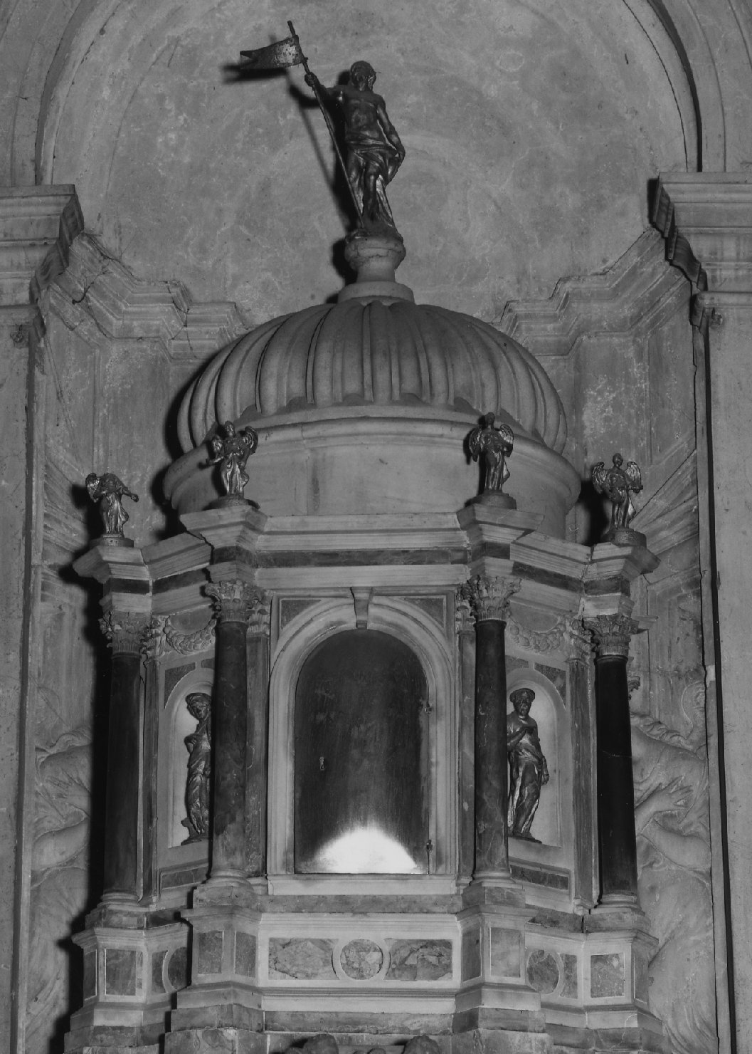 - NOTIZIE STORICO CRITICHE IL TABERNACOLO VENNE COMMISSIONATO A BALDASSARRE LONGHENA DAL PARROCO POMELLI NEL 1633 IN OCCASIONE DEL RINNOVAMENTO DI TUTTO L'ALTARE. PROBABILMENTE L'INTERVENTO DEL LONGHENA SI LIMITA AL DISEGNO DELLA STRUTTURA, COME AFFERMA IL VIO