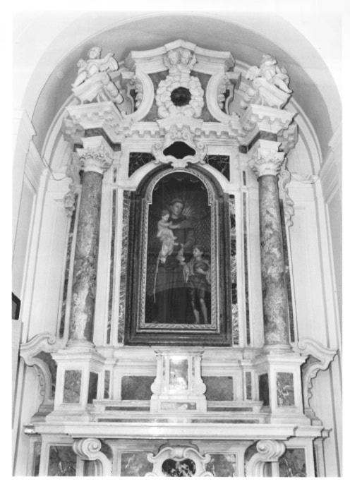 Basamento: con plinti aggettanti ornati sulle facce da specc hiature in ma rmo brecciato; appendici laterali. Colonne: a f usto liscio con capitelli di ordine composito. Frontone: a l inee spezzate ornato con statue acroter iali di angioletti; f astigio centrale con tondo circondato da nuvole, sor montato da coppia di testine angeliche. Incorniciatura di fondo: cen tinat a, sormontata da scudo mistilineo con specchiatura in m armo nero incrocia ta da volute vegetali. Decorazione: penden ti floreali ai lati del fastigi o e sulle lesene retrostanti il dossale