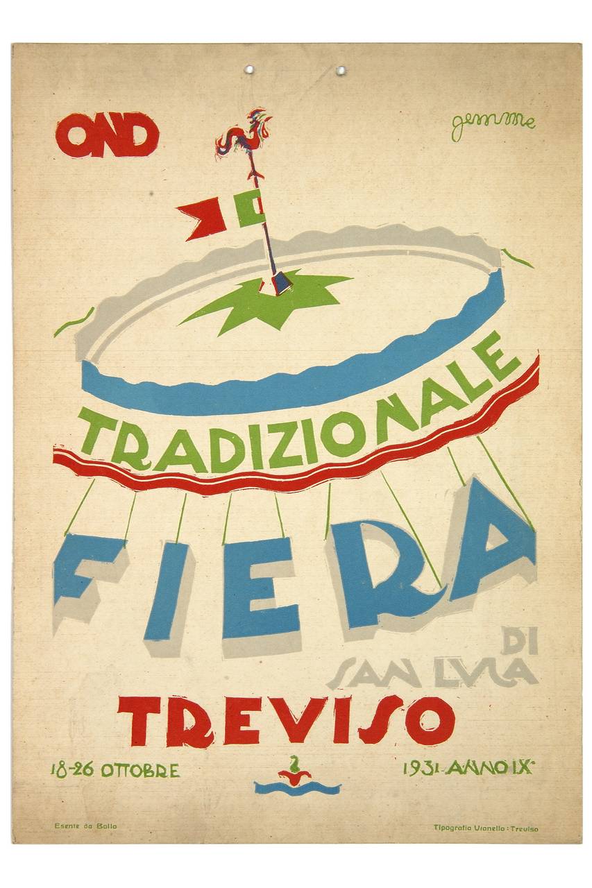 Lettura iconografica: giostra; bandiera italiana; banderuola; gallo. Categoria merceologica/ tipo evento: tempo libero; fiere ricreative; associazioni culturali. Nomi: Fiera di San Luca; OND; Opera Nazionale Dopolavoro. Luoghi: Treviso