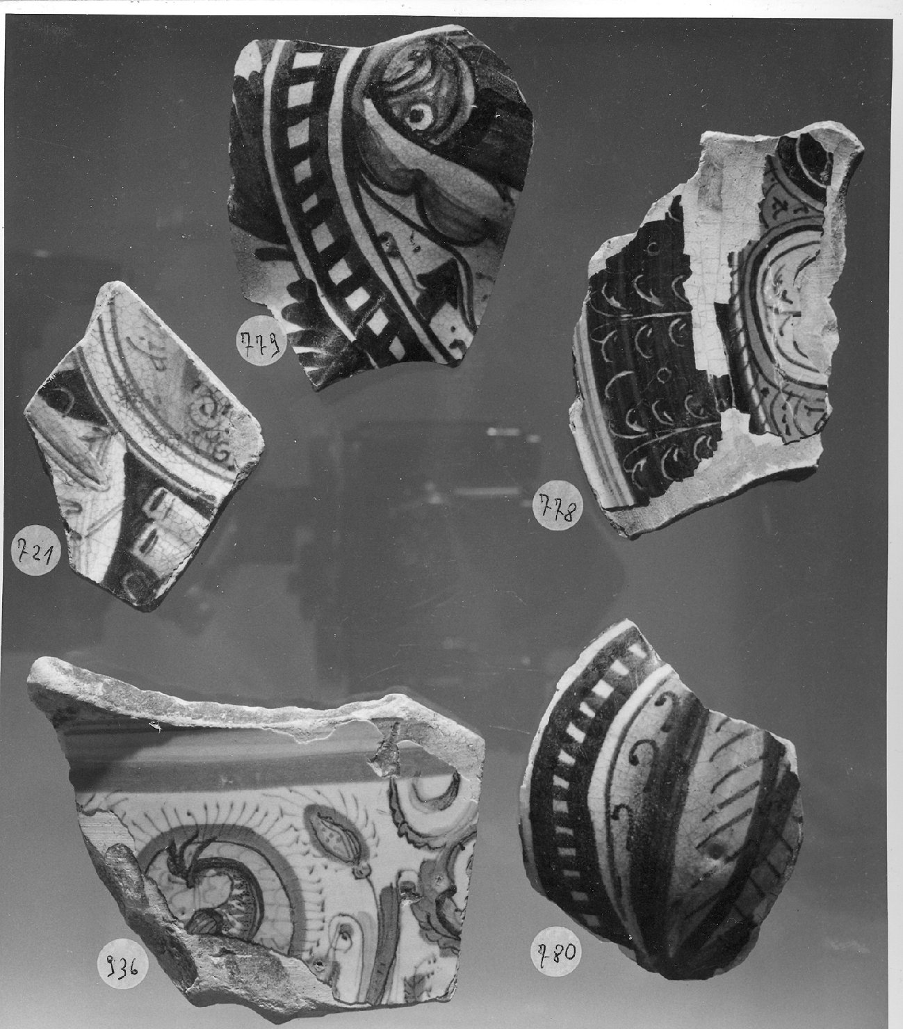 Frammento di vaso bianco sia all' interno che all' esterno. Disegno blu e tocco giallo sul pesce