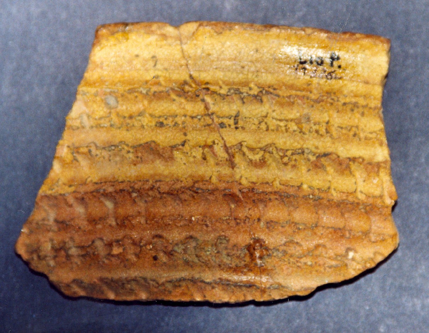 Parete di bacino con bordo ingrossato decorata all' interno da linee orizzontali graffite sotto la tesina; sulla parete linee ondulate oblique contrapposte a segmenti a catena. Colore verde ramina. All' esterno sotto il bordo rotellatura effettuata su cordoli appiattiti su sei file