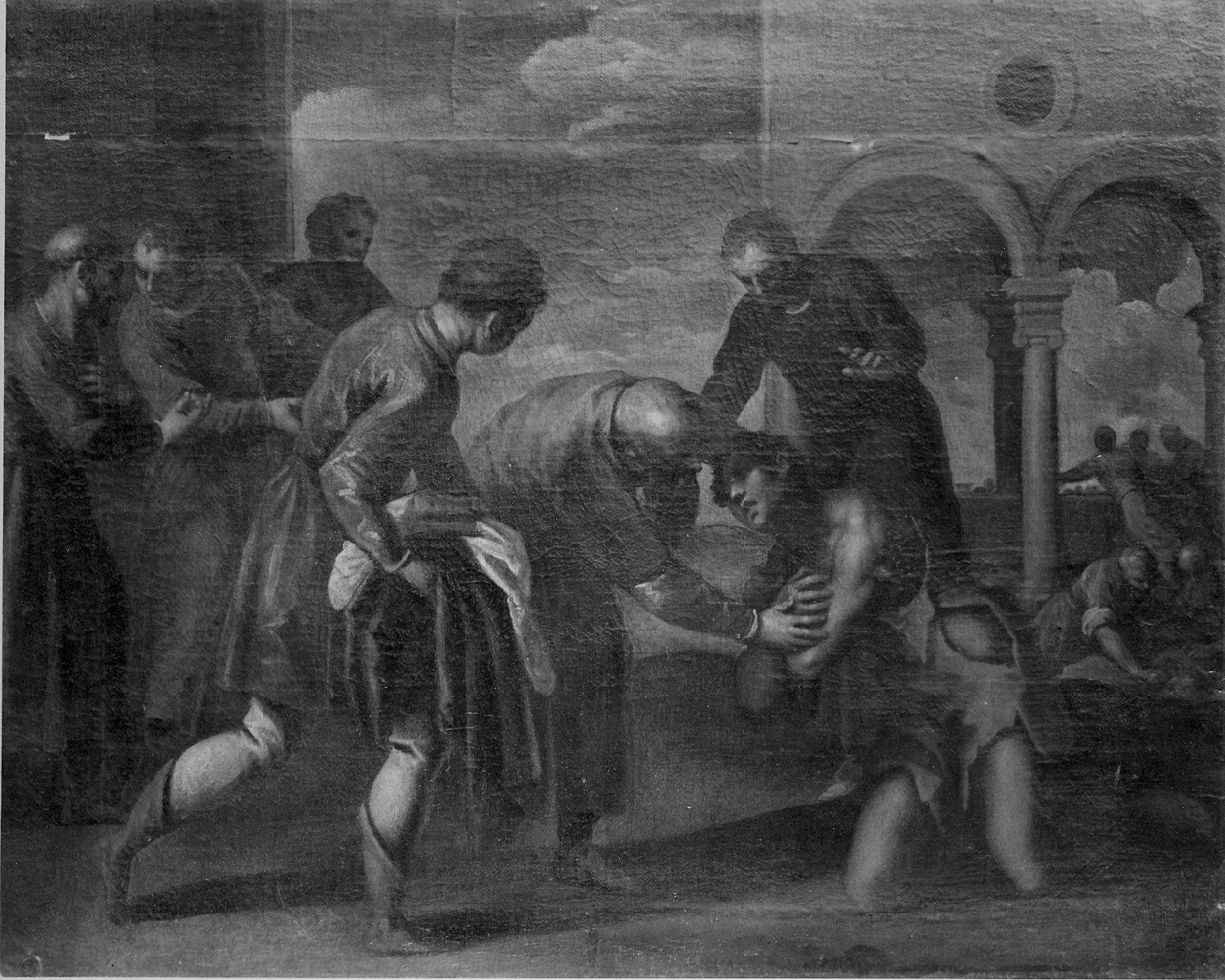 - NOTIZIE STORICO CRITICHE Il dipinto è stato restaurato da A.Lazzarin nel 1958, asportando una larga striscia nella zona superiore e integrando la tela con altra striscia nel margine inferiore.Rispetto alla sensualità dei corpi femminili, all'osten tata ricchezza di cibo e vasellame degli Svaghi del figliol prodigo (cat.n .634),con cui costituisce pendant,,colpisce l'essenzialità della composizi one,tesa a focalizzare l'attenzione dell'osservatore sul padre che si chin a verso il figlio inginocchiato,mentre i preparativi per il banchetto sono appena accennati nello sfondo. "La scena assume così un significato prett amente controriformistico,configurando il sacramento della confessione,com e immagine quindi del perdono accordato al pentimento" (Mason Rinaldi 1984 ). Significato penitenziale che non escluderebbe secondo Aikema e la Meije rs (1989) anche una esortazione alla carità.Databile tra la fine del Cinqu ecento e gli inizi del Seicento. Per Aikema e Meijers del 1600 circa