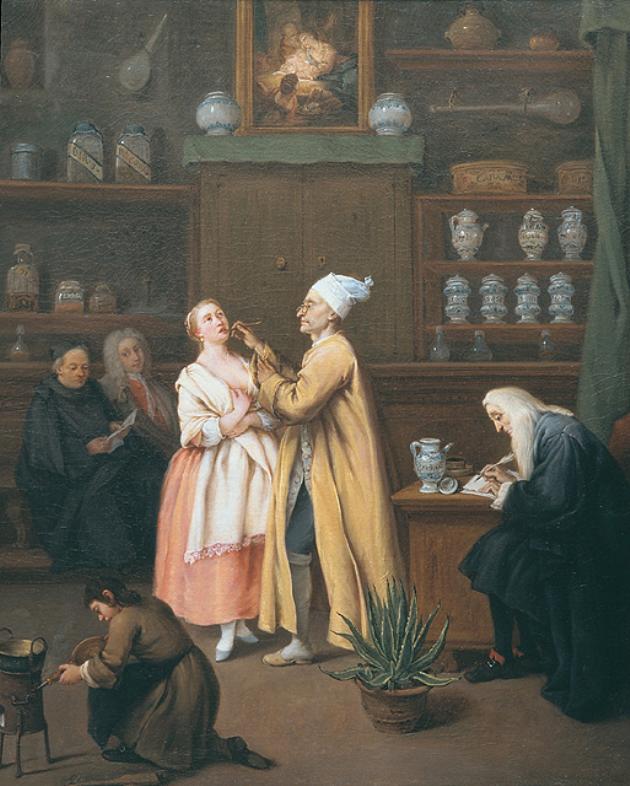 - NOTIZIE STORICO CRITICHE Firmato sul retro, è forse il più noto dipinto dell'artista. L'interno desritto tanto minuziosamente che si è potuto identificare nel quadretto con la "Natività" un'opera di Antonio Balestra, tuttora esistente in collezione privata veneziana, evoca con straordinaria efficacia la bottega settecentesca di uno speziale. Avvicinabile al "Il rinoceronte" di Ca' Rezzonico, datato 1751
