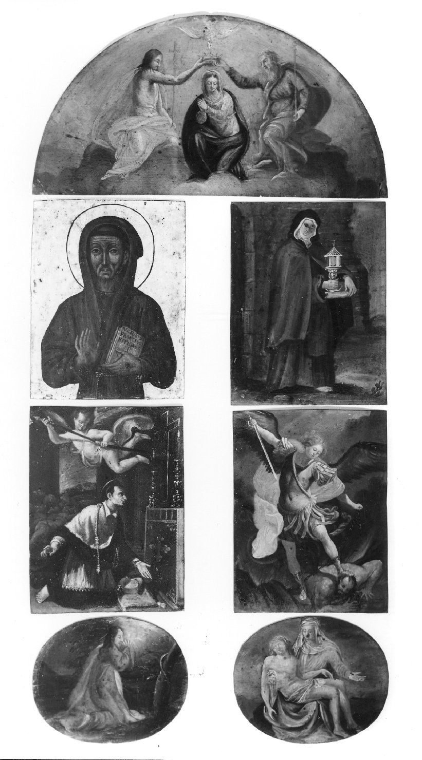 - NOTIZIE STORICO CRITICHE La Moschini Marconi S. scrive: cat. n. 668 a/l "E' un gruppo di piccole copie e derivazioni da opere di epoche e autori diversi... disposte e adattate in modo da formare una specie di trittico. E' probabile che esse siano state eseguite nel primo Ottocento, e sembrano della stessa mano. Lavori del genere erano frequenti in quel periodo e conviene forse ricordare che la pittrice Marianna Pascoli Angeli e la sorella Luigia Pascoli eseguivano copie in miniatura di quadri antichi, molte delle quali furono esposte alla mostra allestita nel 1838 all'Accademia in onore di Ferdinando I in visita a Venezia"
