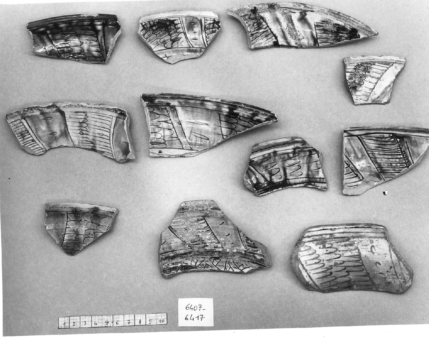 Parete e bordo di piatto con tesa ricurva. Motivo di "robbiana" entro banda. Colore giallo-ocra e tracce di cobalto