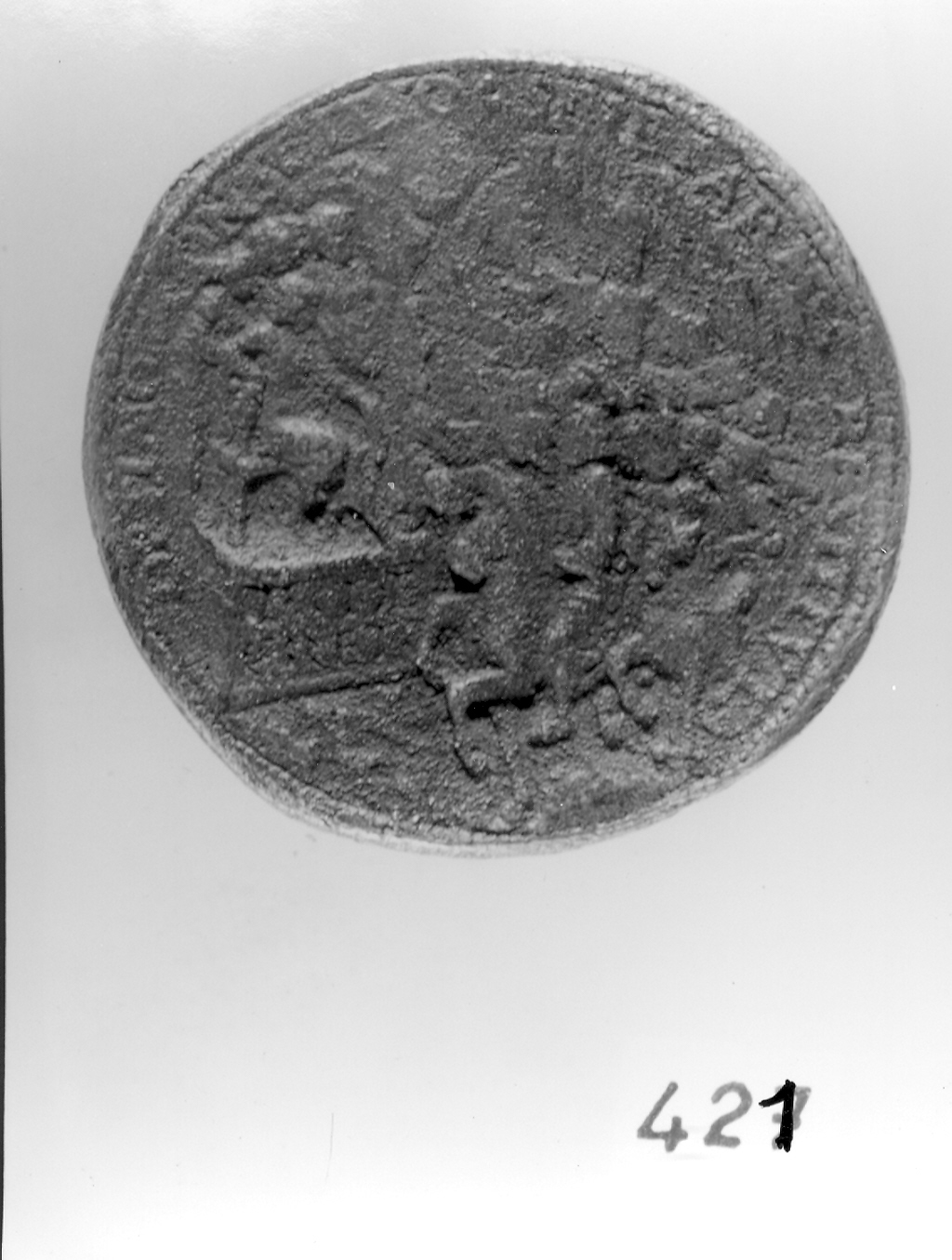 - ISCRIZIONI lungo la circoferenza - OPTIMO. CONSCILIO. SINE. ARMIS. RESTITVTA. P. DECRETO - lettere capitali - a rilievo -