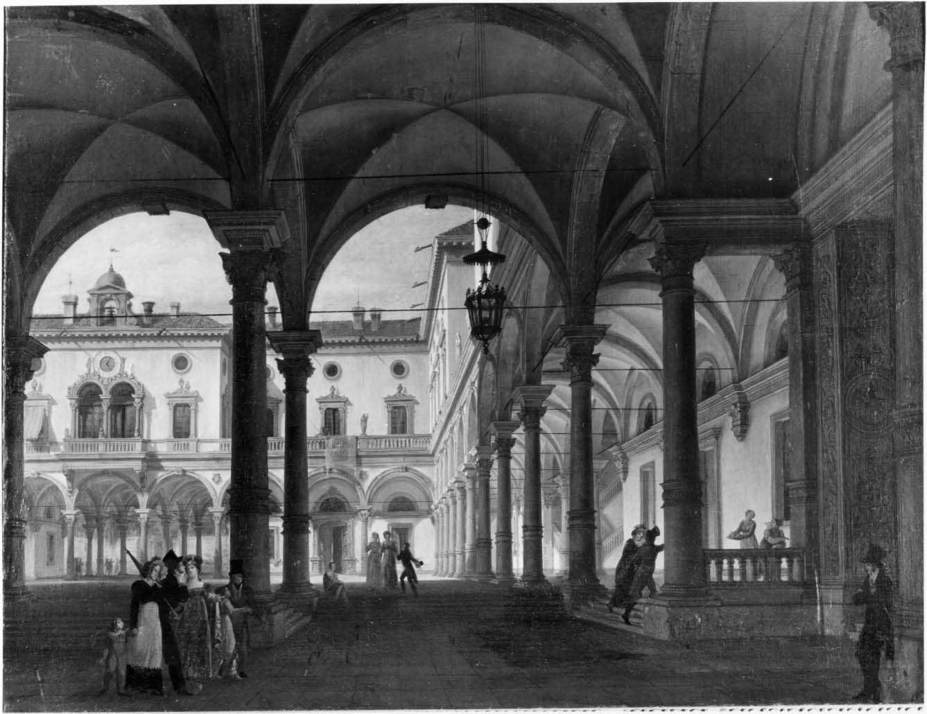 Architetture: chiostro colonnato. Figure: uomini; donne; bambini