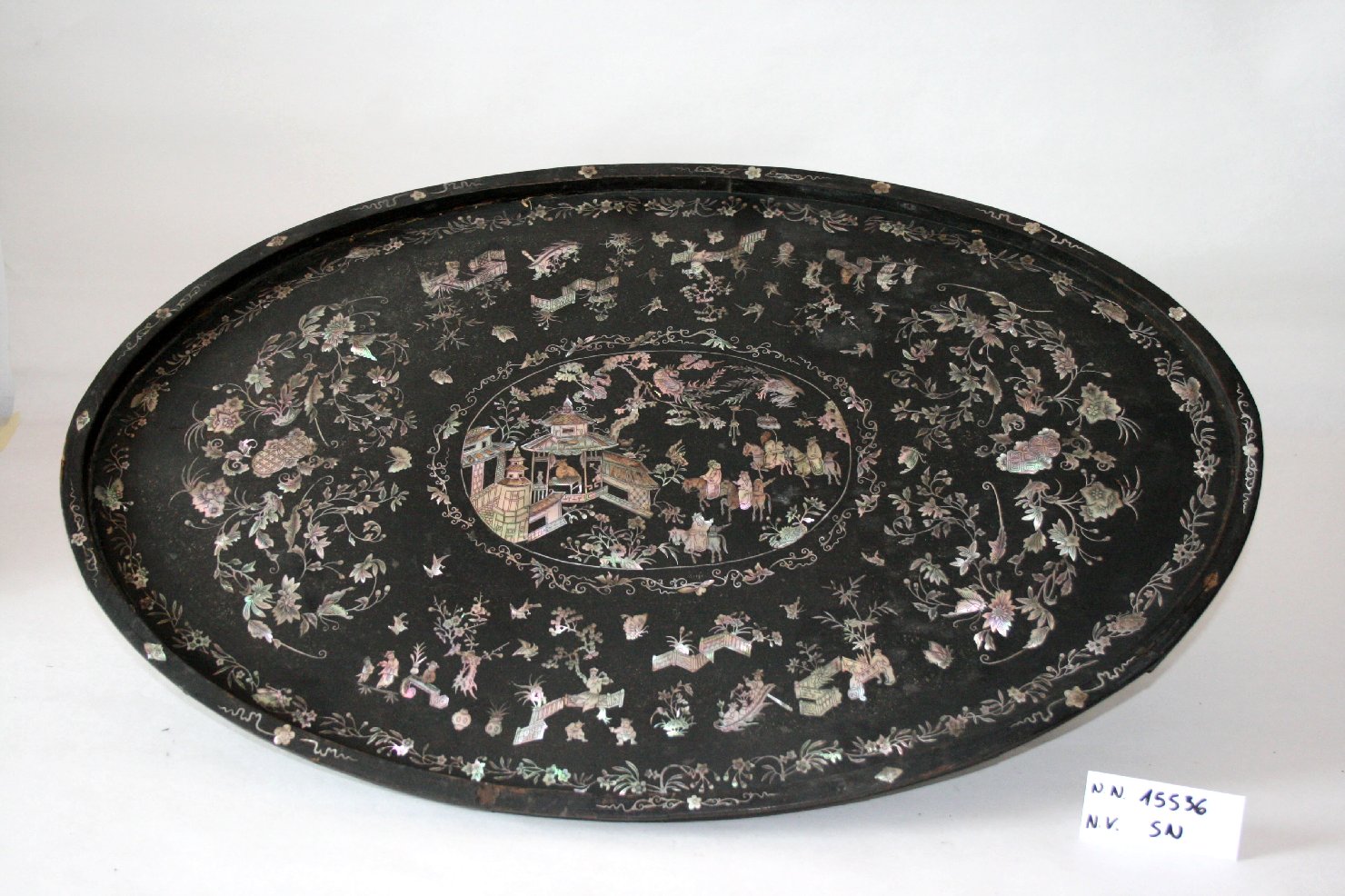Vassoio con intarsiata scena centrela di nobili a cavallo che giungono a palazzo, accompagnati da servi; intorno sono presenti decorazioni floreali e scene più piccole di nobili e apsara che scacciano dei demoni