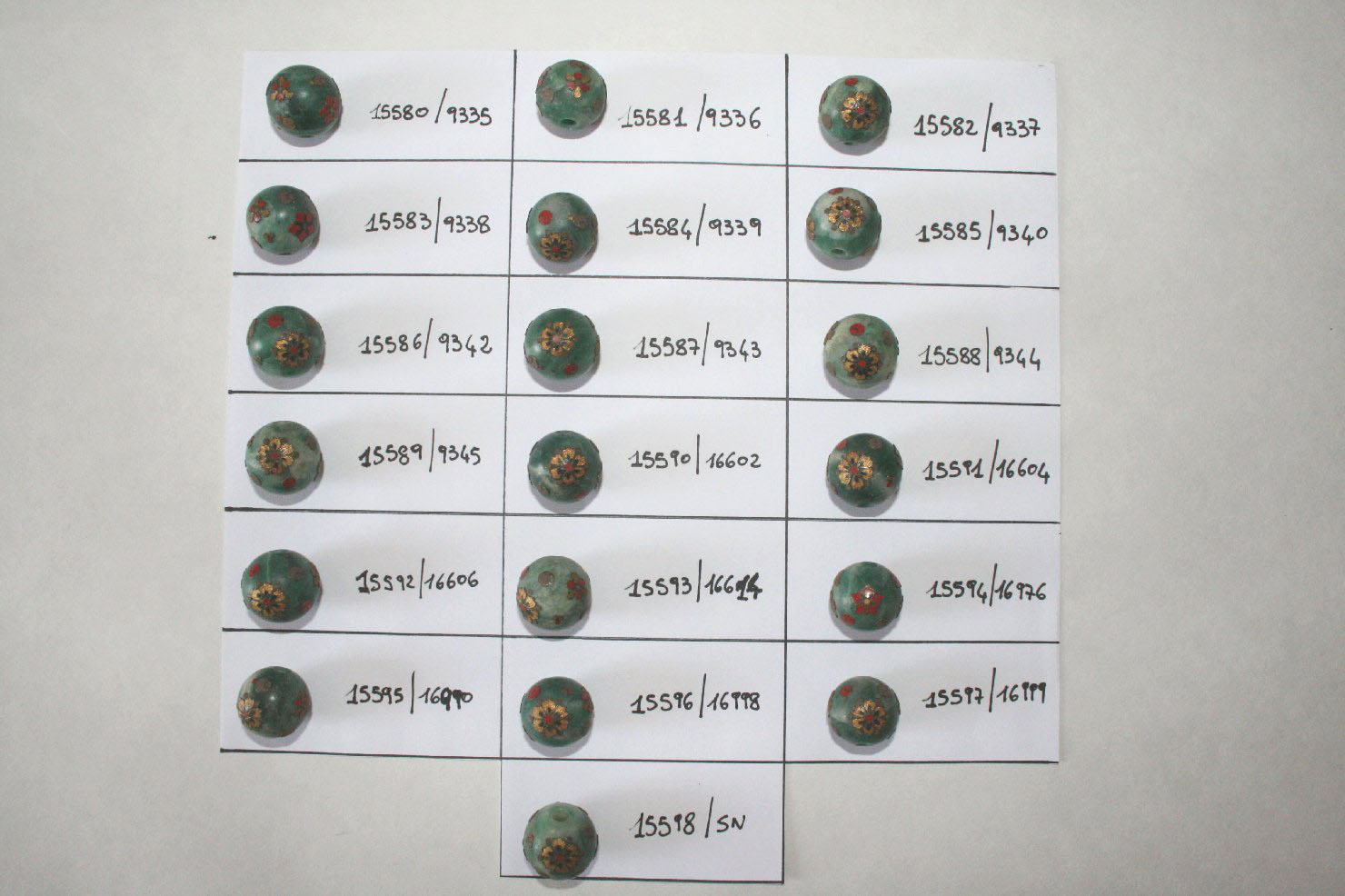 Ojime di forma sferica con applicate decorazioni metalliche smaltate e dorate a forma di fiore e cerchi