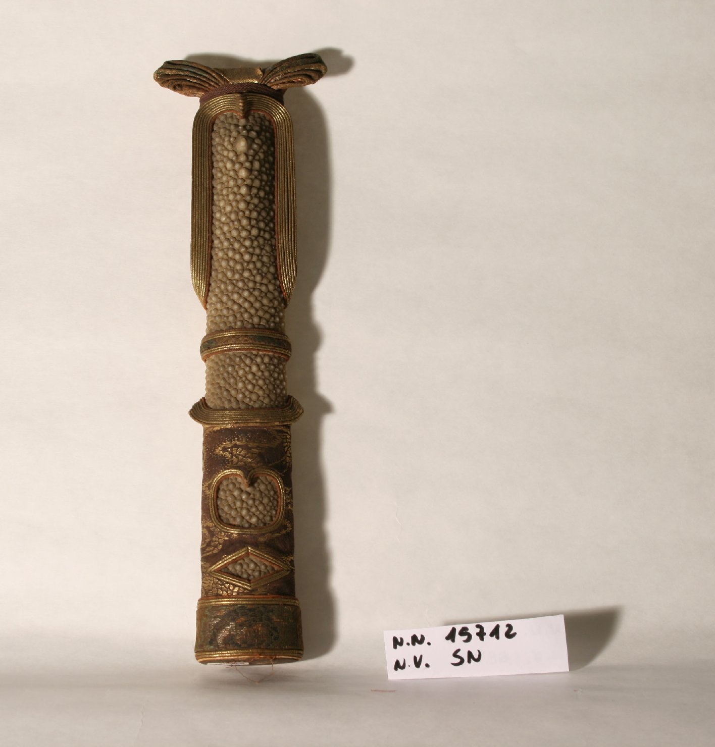 Scettro per sacerdote di scuola tantrica, con corpo foderato di pelle e decorata con copertura in seta violacea broccata