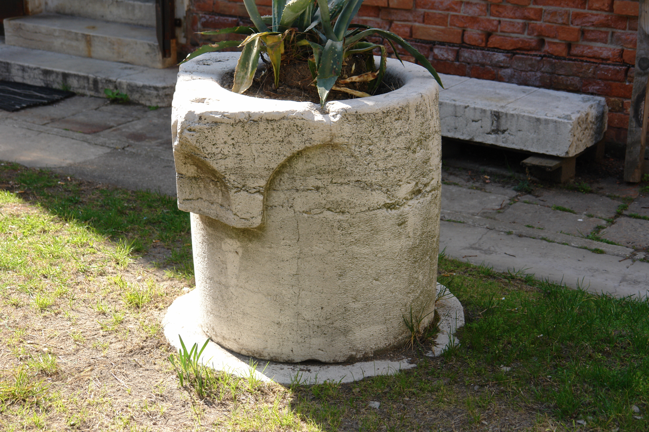 - NOTIZIE STORICO CRITICHE la mancanza di stemmi araldici o elementi epigrafici non permette di datare con certezza la vera in esame che presenta secondo la definizione di Rizzi (1981) la tipologia tradizionale veneziana. Fusti di questo tipo, cilindrici con sovrapposti elementi quadrati o poligonali ad archetti sporgenti e angoli scantonati, appartengono al Trecento (Arslan, 1976), ma furono utilizzati seppur in diverse varianti fino a tutto il Cinquecento. Non si esclude che la presenza di mezzo elemento quadrato sulla parte superiore sia da ricondurre ad una possibile collocazione della vera a cavallo di una muratura, in modo tale che vi si potesse attingere sia da un locale che da quello attiguo, forse, non raro a Venezia, quello destinato al loco da lissa, ovvero luogo per il bucato. Si ricorda che la vera in esame potrebbe provenire dal demolito complesso monastico Cinquecentesco della chiesa degli Ognissanti. Nel 1900 il Comune di Venezia donò il monastero e la chiesa all'opera pia Gio Batta Giustinian, senatore, già podestà e sindaco di Venezia tra il 1866-68 ed il 1877-78, istituita, per volere testamentario dalla vedova Elisabetta Michiel nel 1888. Il 2 aprile 1904 fu posta la prima pietra del nuovo fabbricato, progettato dall'ingegner Attilio Cadel, a tre piani e pianta quadrangolare sull'area dei vecchi edifici già abbattuti. I lavori terminarono nel 1908