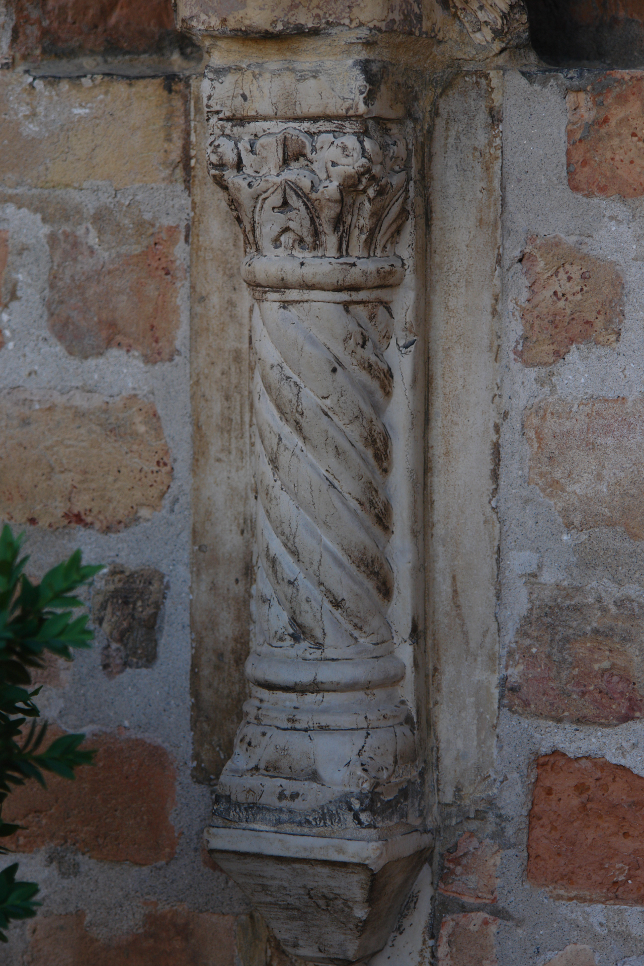 colonnina a tortiglione con alto toro sia alla base che alla sommità inferiore del fusto; il capitello è arricchito da foglie d'acanto e rosette agli angoli. L'elemento architettonico posa su mensola lavorata a base quadrata