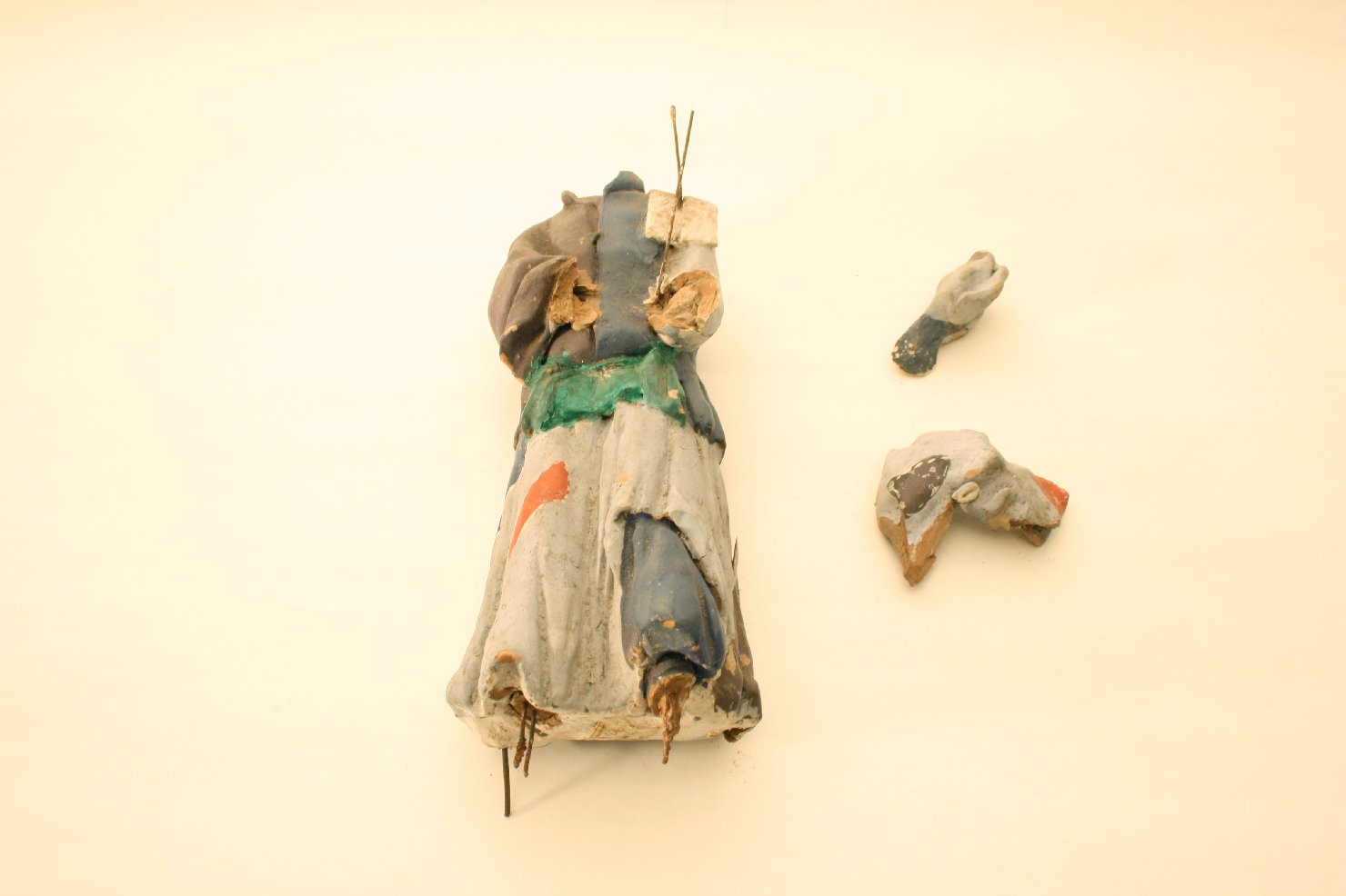 Statuetta frammentaria di monaco abbigliato con tonaca bianca e casacca marrone e grigia