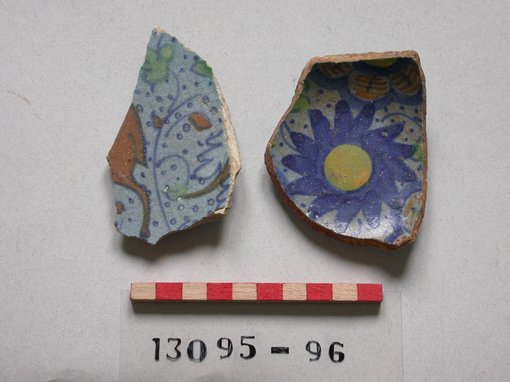 Frammento di fondo di piatto; corpo ceramico beige. Si tratta di un oggetto rivestito di smalto azzurrino e dipinto in verde, arancione e blu: si legge una porzione di animale circondato da tralci; il fondo è puntinato. All'esterno è presente il motivo del canestro