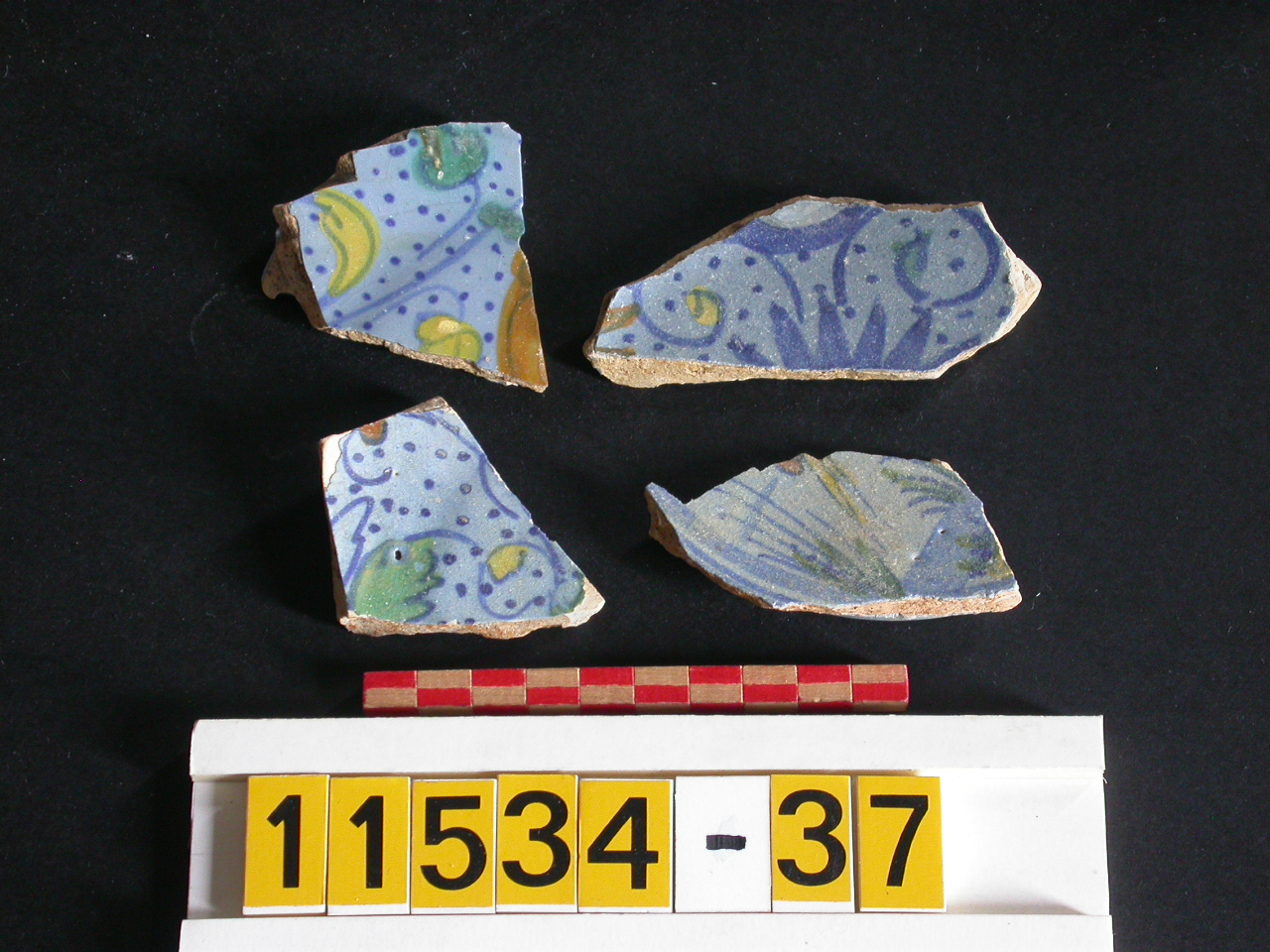 Frammento di fondo di piatto. Decoro dipinto in blu, giallo, verde e arancio su fondo azzurro puntinato in blu: porzione di animale non riconoscibile contornato da tralci