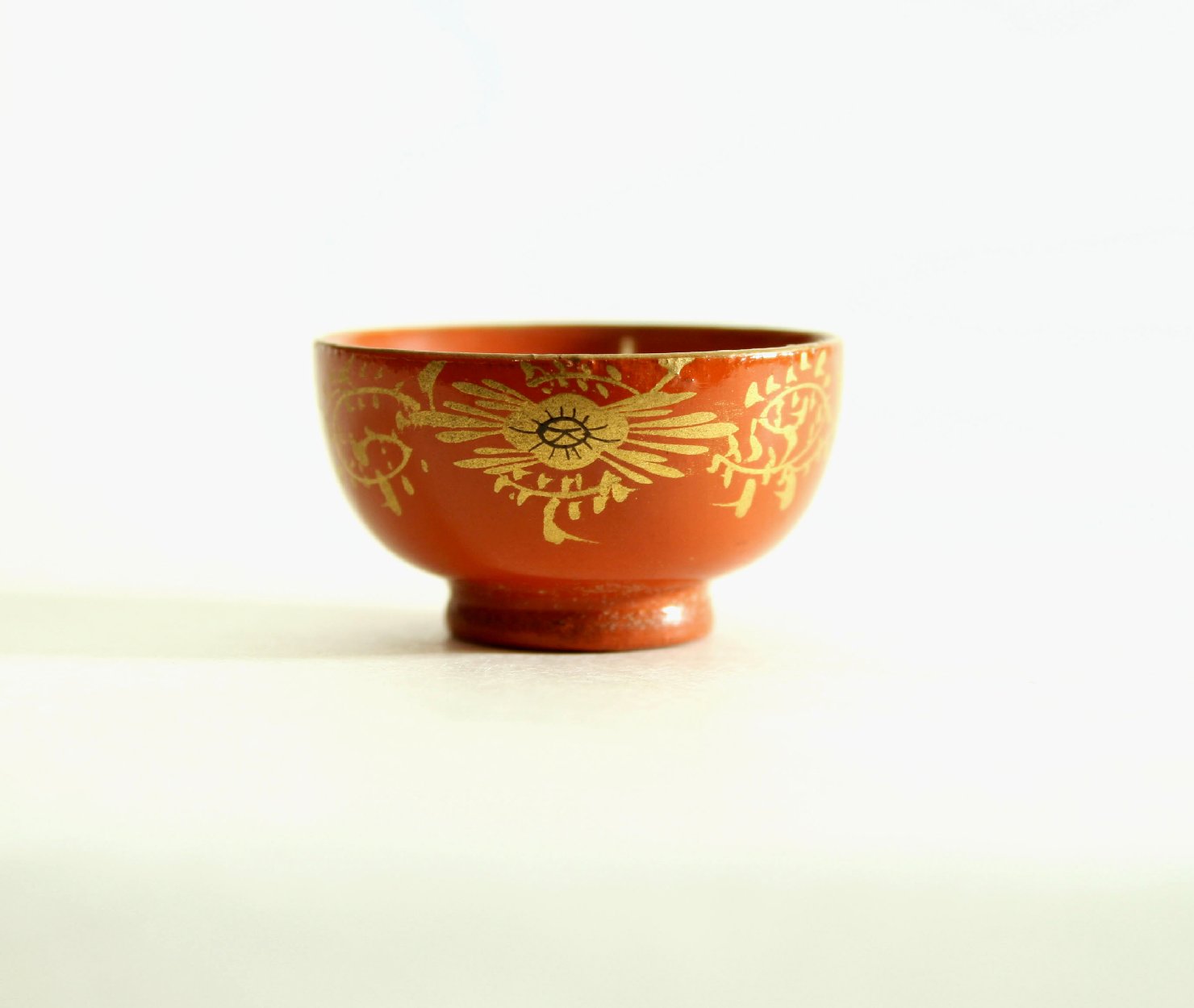 Coppetta giocattolo su piede ad anello decorata con fiori, foglie e rami dorati su fondo rosso
