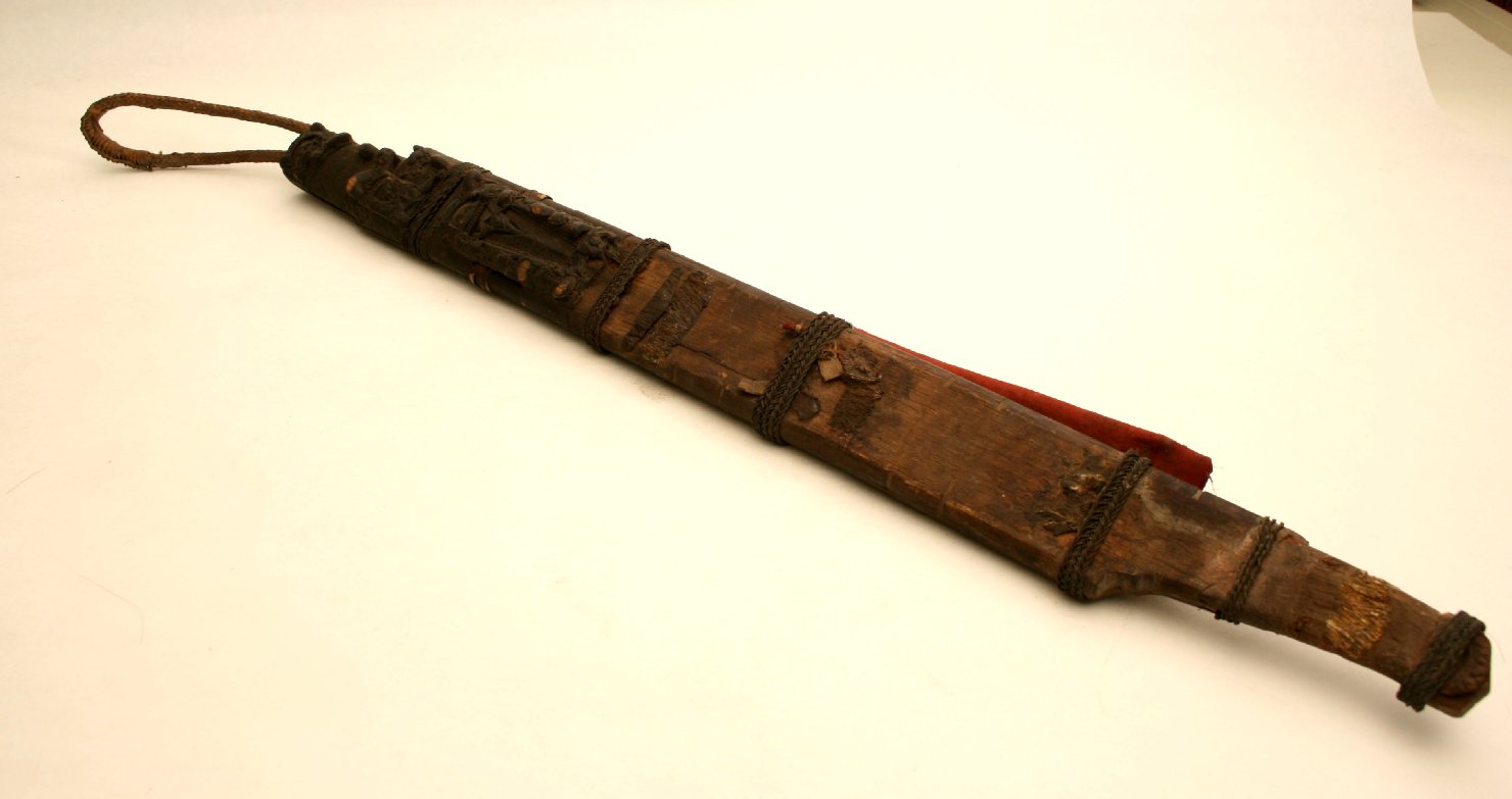 Fodero piatto per spada decorato sulla parte superiore con motivo vegetale intagliato; sul corpo sono applicate fascette intrecciate e un fodero rosso portapugnale con laccio