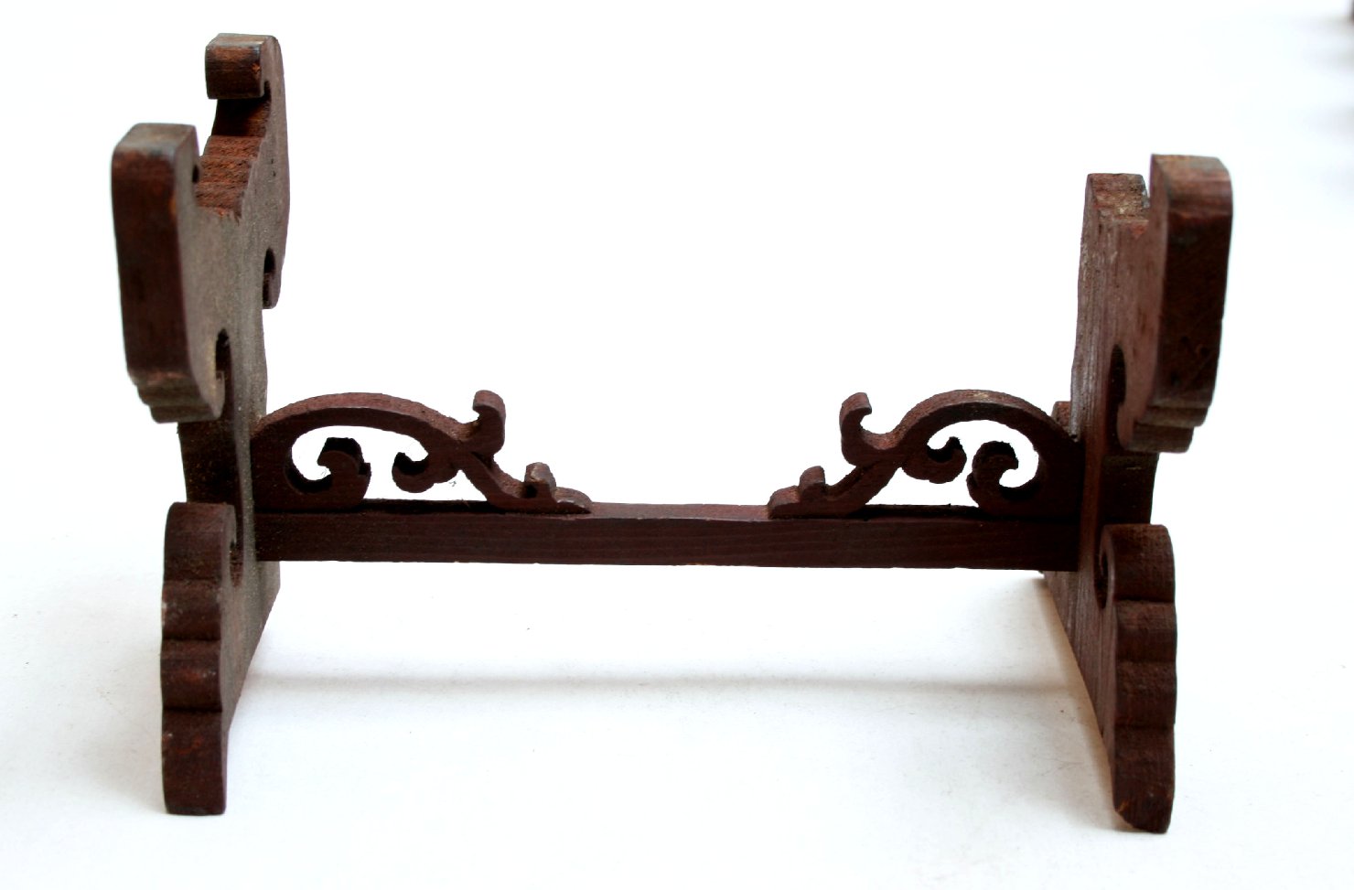 Supporto a due braccia intagliate a volute con parte centrale decorata da due applicazioni a motivo vegetale