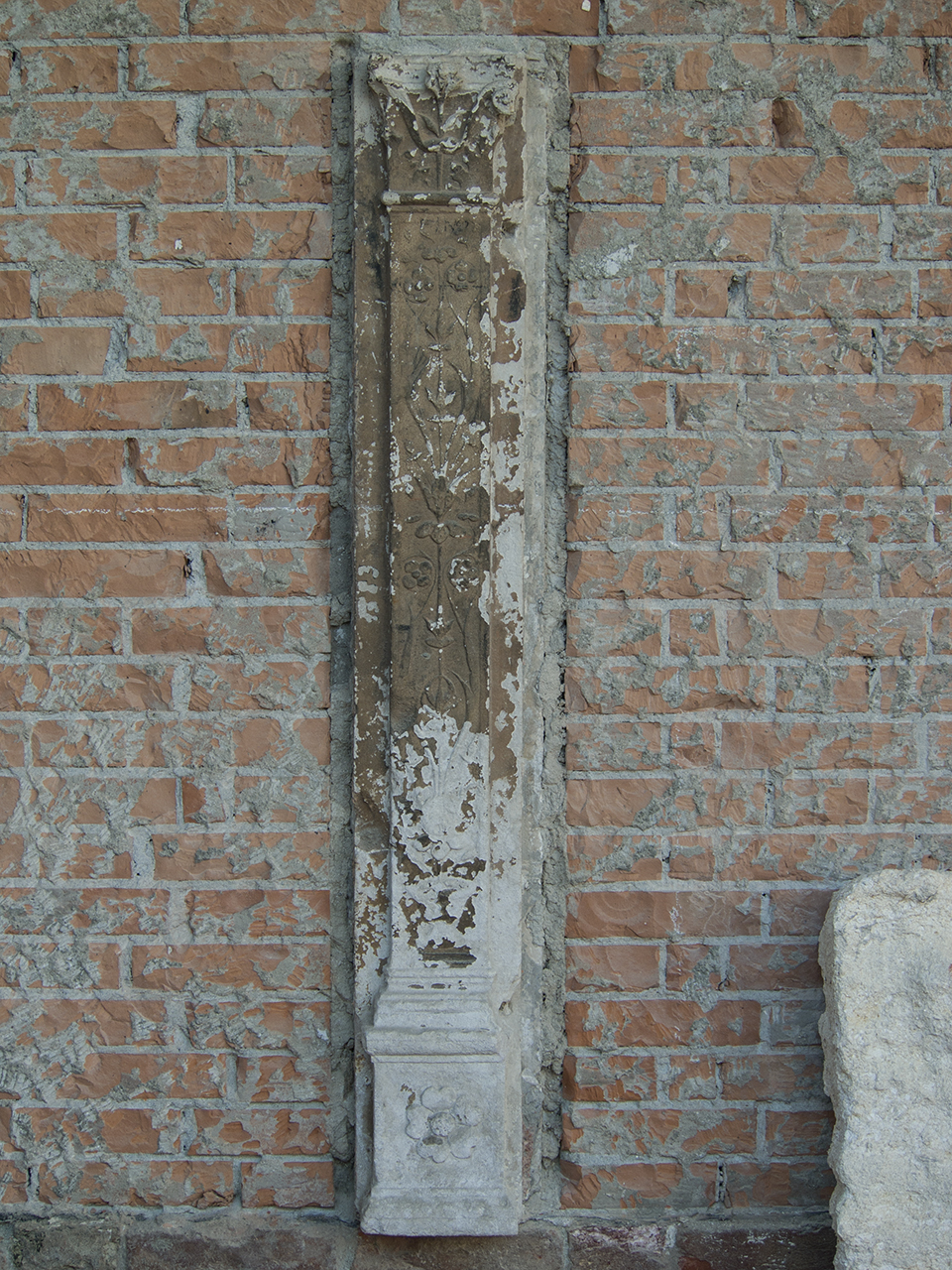 lesena con decorazioni a rilievo di tipo a candelabra adorna da motivi floreali. Caulicolo centrale e foglie laterali, quella di destra terminante con voluta sul capitello. Rosetta a cinque petali sul basamento