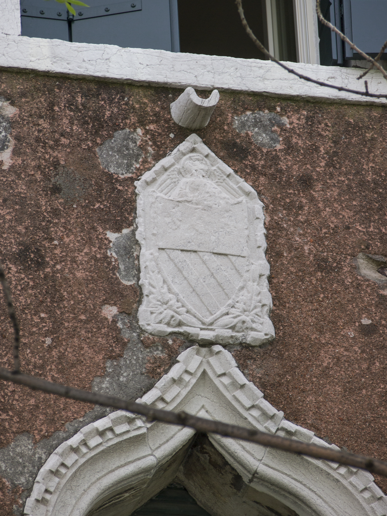 - NOTIZIE STORICO CRITICHE lo stemma della famiglia Moro, originaria di Eraclea, compresa alla Serrata del Maggior Consiglio, nel 1297, tra le famiglie patrizie più antiche di Venezia, è cimato da una figura alata con il volto scalpellato, sicuramente un angelo. Nel periodo gotico tra le figure in protome poste sugli stemmi gentilizi si ritrovano angeli, santi o la Vergine e diversi sono gli esempi con il leone nimbato ad ali spiegate, simbolo unico della Repubblica Veneziana. Tutti assumevano il ruolo apotropaico di protezione della famiglia. Si ricorda che in origine gli stemmi lapidei come questo avevano la superficie smaltata per permettere di distinguere i diversi rami di una stessa famiglia o famiglie con la stessa partizione araldica. I Moro avevano l'arma d'argento a tre bande d'azzurro; col capo del primo, caricato di tre more di nero, i gambi in alto (Crollalanza G.B.)