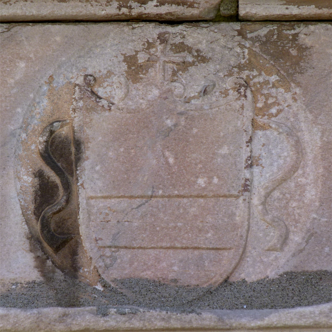 sovraporta di architrave di porta costituito da più elementi marmorei con al centro, entro clipeo, stemma con ai fianchi due nastri svolazzanti e soprastante crocetta latina
