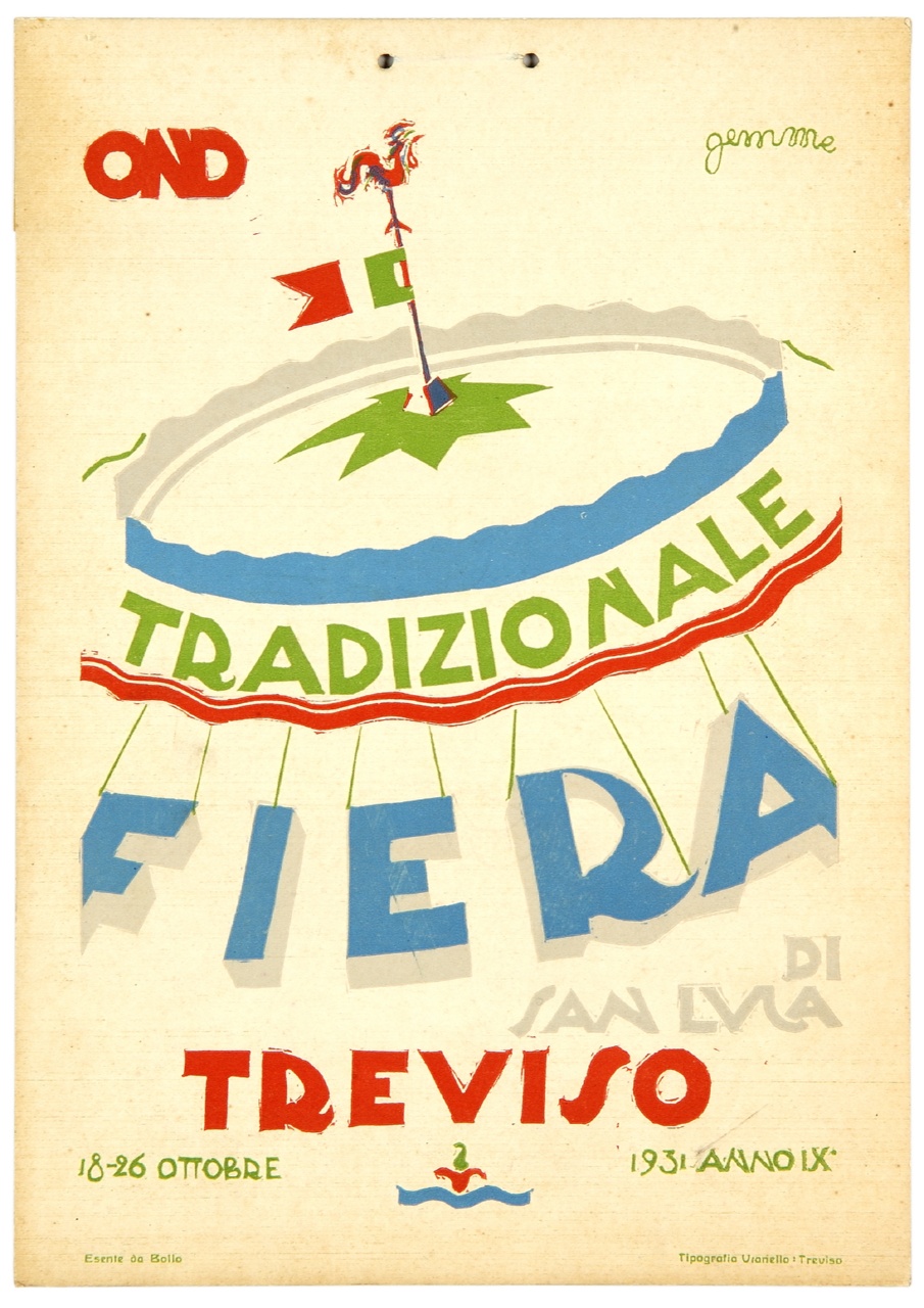 Lettura iconografica: giostra; bandiera italiana; banderuola; gallo. Categoria merceologica/ tipo evento: tempo libero; fiere ricreative; associazioni culturali. Nomi: Fiera di San Luca; OND; Opera Nazionale Dopolavoro. Luoghi: Treviso