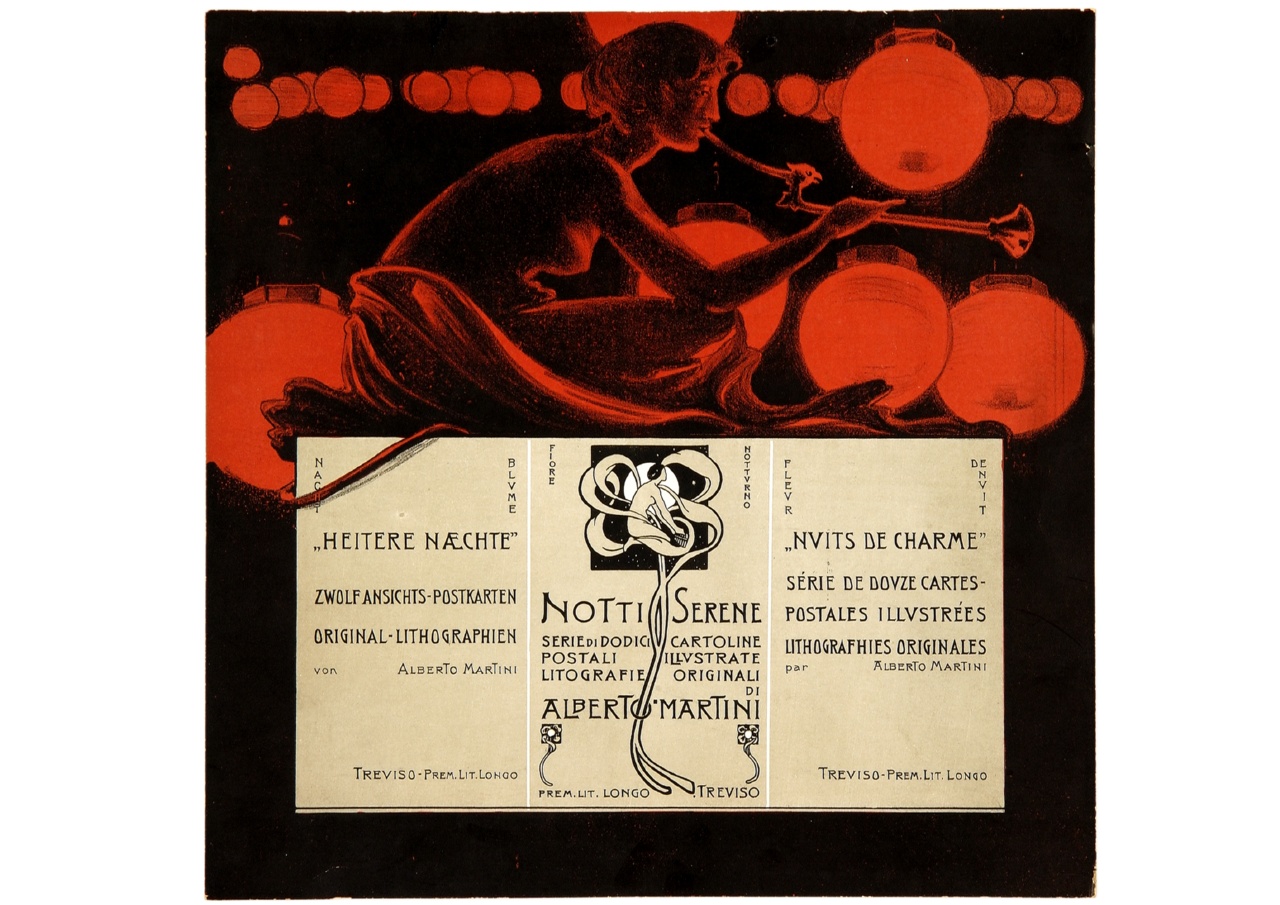 Lettura iconografica: figura femminile; pipa; lanterne cinesi. Categoria merceologica/ tipo evento: informazione e comunicazione; editoria; cartolina postale. Nomi: Notti serene; Fiore notturno; Alberto Martini. Luoghi: Treviso