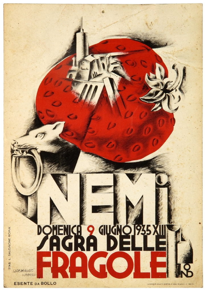Lettura iconografica: veduta di Nemi; piazza; architetture; chiesa; edifici; frutta; fragola; animali; cane; anello; fascio littorio. Categoria merceologica/ tipo evento: tempo libero; sagre; associazioni culturali. Nomi: Sagra delle fragole; OND; Opera Nazionale Dopolavoro. Luoghi: Roma; Nemi