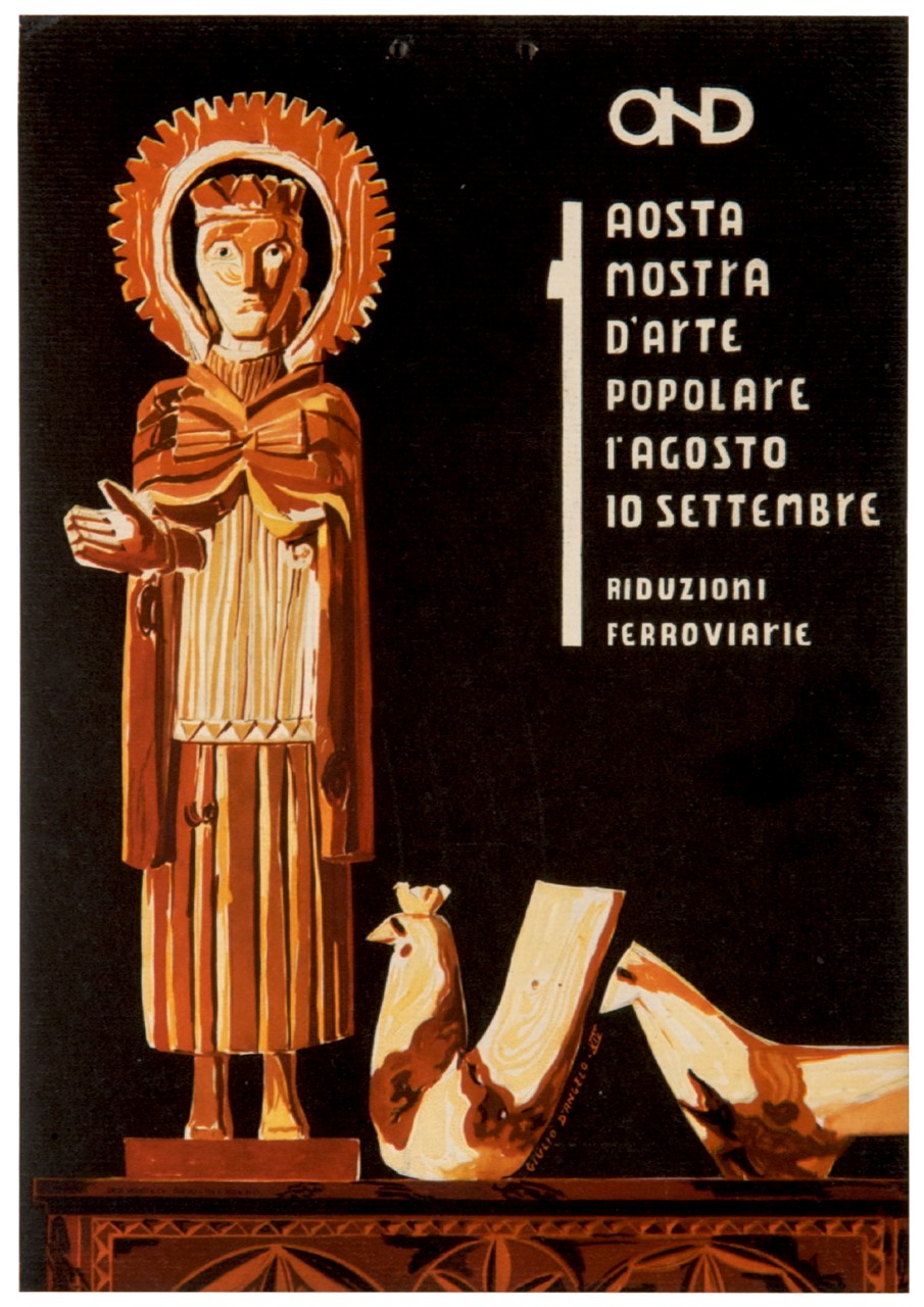 Lettura iconografica: statua di santo; animali. Categoria merceologica/ tipo evento: manifestazioni culturali; mostre; mostra etnografica; mostra d'arte; associazioni culturali; riduzioni ferroviarie. Nomi: 1 Mostra d'Arte Popolare; Collezione Brocherel; OND; Opera Nazionale Dopolavoro. Luoghi: Aosta