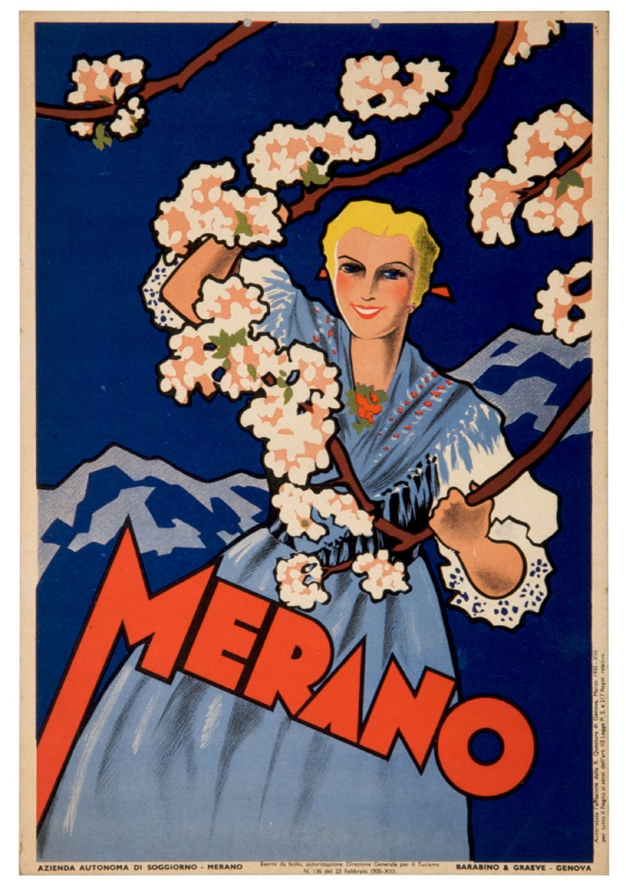 Lettura iconografica: figura femminile; costume tirolese; ramo fiorito; montagne. Categoria merceologica/ tipo evento: turismo; montagna; enti di promozione turistica. Nomi: Azienda autonoma di soggiorno di Merano. Luoghi: Bolzano; Merano