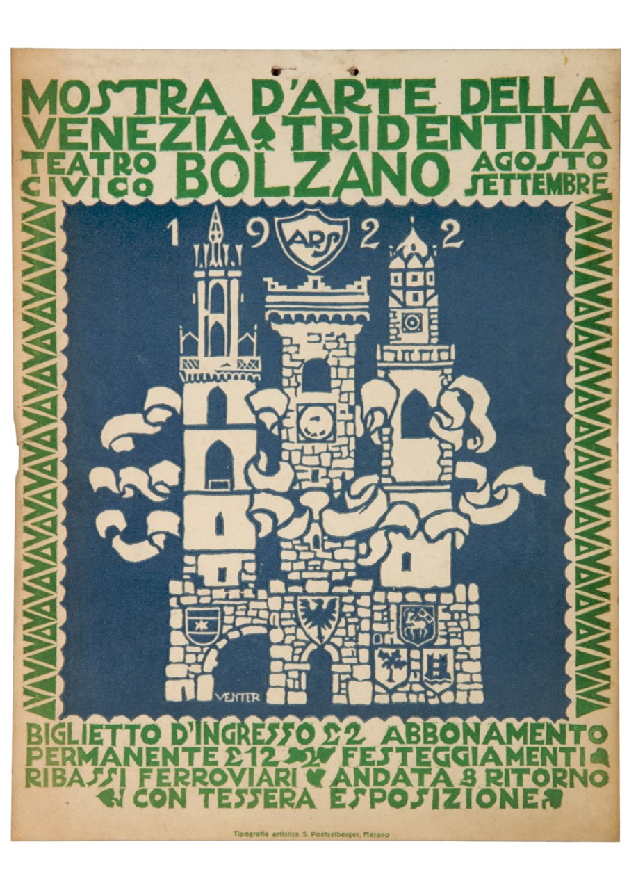 Lettura iconografica: architetture; edificio fortificato. Categoria merceologica/ tipo evento: manifestazioni culturali; mostre; mostra d'arte; tempo libero; feste; riduzioni ferroviarie. Nomi: Mostra d'Arte della Venezia Tridentina; Teatro Civico. Luoghi: Bolzano