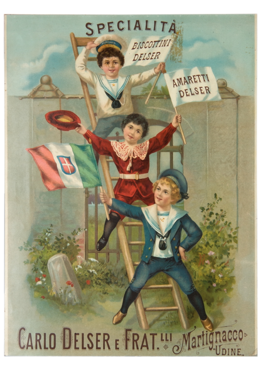 Lettura iconografica: bambini; scala; bandiera; cartelli; cancello. Categoria merceologica/ tipo evento: industria alimentare; prodotti da forno; biscotti; amaretti. Nomi: Carlo Delser e Fratelli. Luoghi: Udine; Martignacco