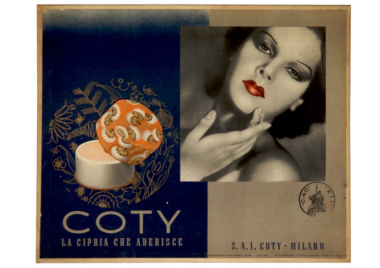 Lettura iconografica: volto femminile; rossetto; scatola; cipria. Categoria merceologica/ tipo evento: industria chimica; cosmetici; cipria. Nomi: Coty; Società Anonima Italiana Coty. Luoghi: Milano