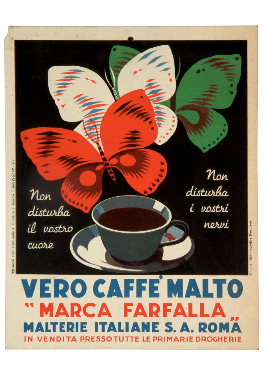 Lettura iconografica: tazza di caffè; farfalle. Categoria merceologica/ tipo evento: industria alimentare; succedanei del caffè; caffè di malto. Nomi: Malterie Italiane Società Anonima. Luoghi: Roma