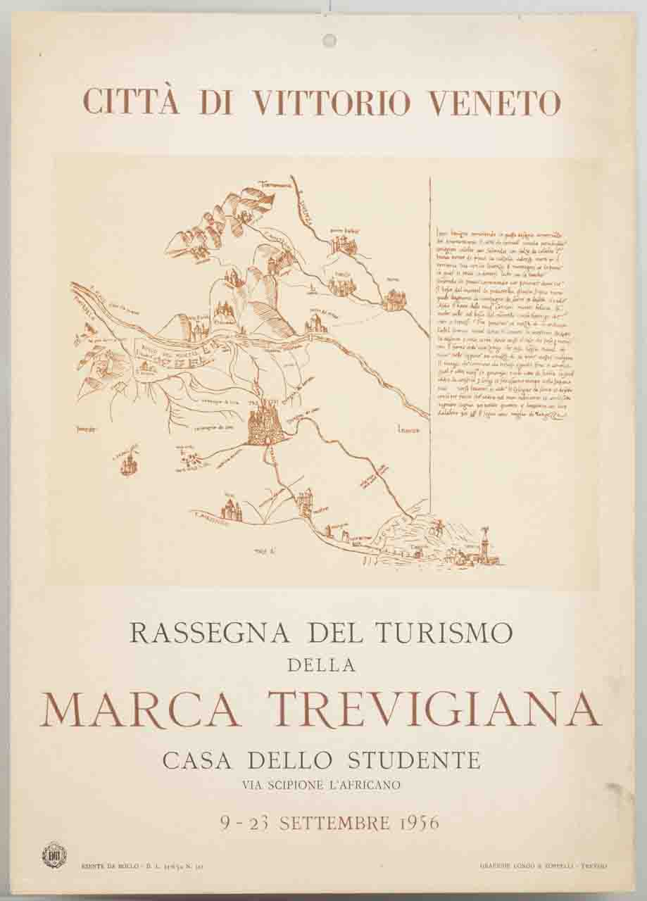 Lettura iconografica: riproduzione fotografica di disegno; carta storica corografica del territorio trevigiano. Categoria merceologica/ tipo evento: turismo; rassegne; enti di promozione turistica; amministrazione pubblica; enti locali; amministrazione comunale. Nomi: Rassegna del turismo della Marca trevigiana; Città di Vittorio Veneto; Casa dello studente; ENIT; Ente Nazionale per l’incremento delle Industrie Turistiche; Malipensa Giovanni Maria. Luoghi: Treviso; Vittorio Veneto