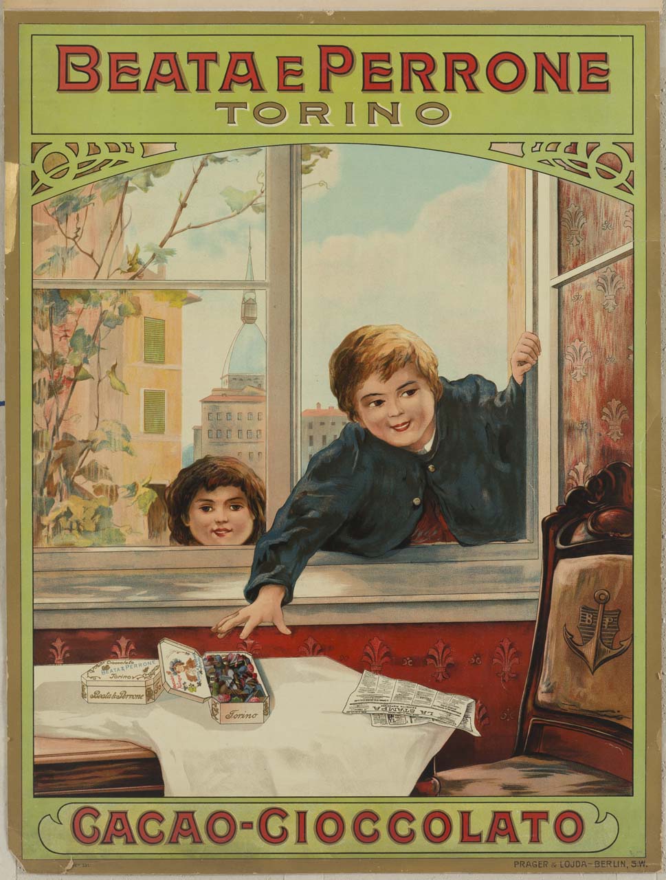 Lettura iconografica: due bambini; confezioni di cioccolatini; veduta di città. Categoria merceologica/ tipo evento: industria alimentare; cacao; cioccolato; dolciumi al cioccolato; cioccolatini. Nomi: Beata e Perrone; Mole Antonelliana. Luoghi: Torino