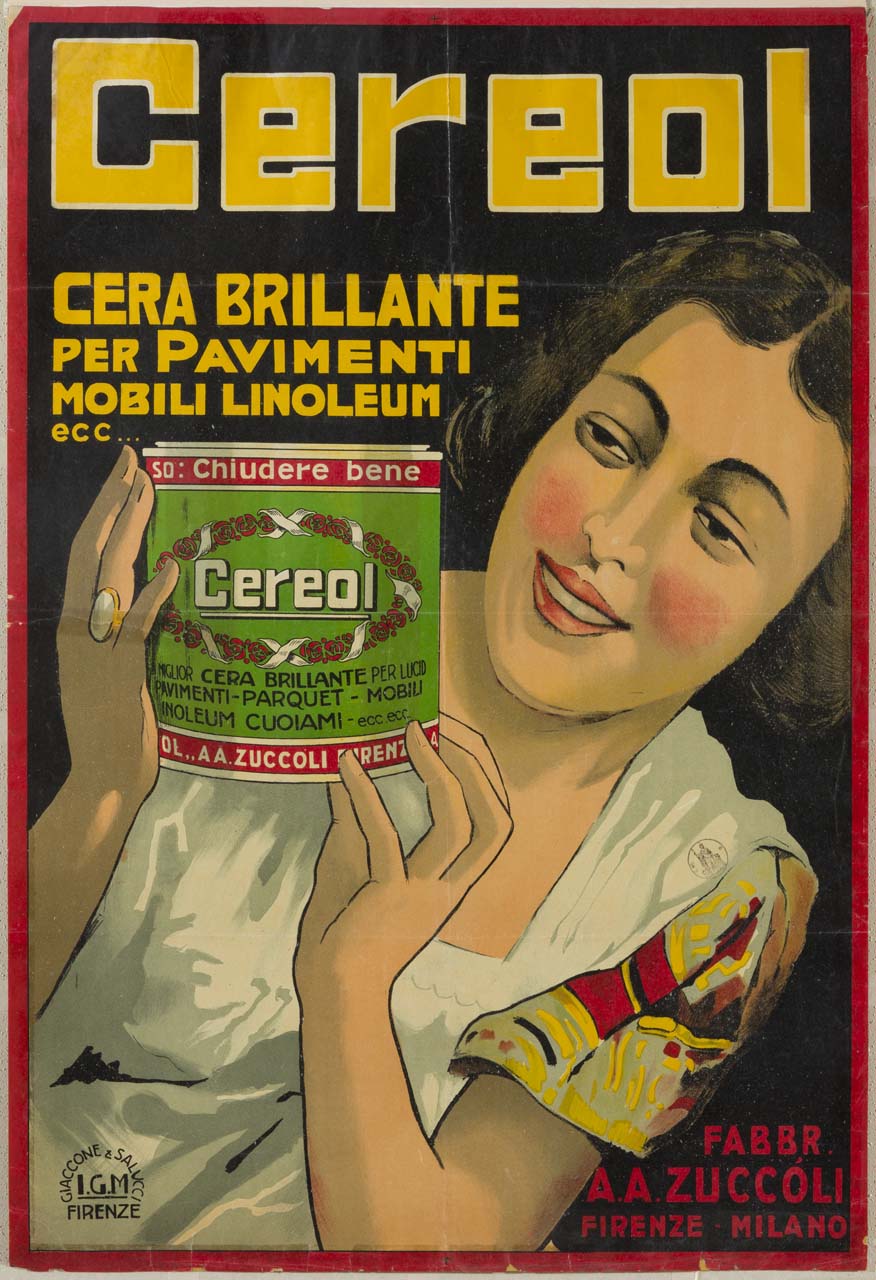 Lettura iconografica: figura femminile; sorriso; barattolo di cera. Categoria merceologica/ tipo evento: industria chimica; prodotti per la casa e la manutenzione; cera per pavimenti; cera per mobili; cera per cuoio. Nomi: Cereol Cera Brillante; Fabbrica A. A. Zuccoli. Luoghi: Firenze; Milano