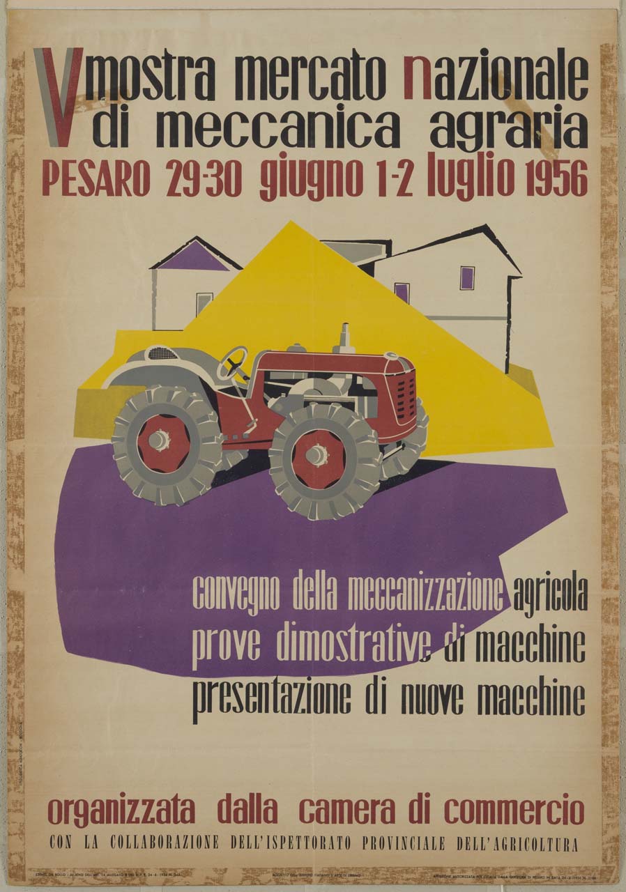 Lettura iconografica: trattore; case; abitazioni. Categoria merceologica/ tipo evento: industria meccanica; macchine agricole; mostre mercato; convegni; manifestazioni; associazioni economiche; amministrazione pubblica; amministrazione centrale; Ministero dell’Agricoltura. Nomi: V Mostra Mercato Nazionale di Meccanica Agraria; Convegno della Meccanizzazione Agricola; Camera di Commercio; Ispettorato Provinciale dell'Agricoltura. Luoghi: Pesaro
