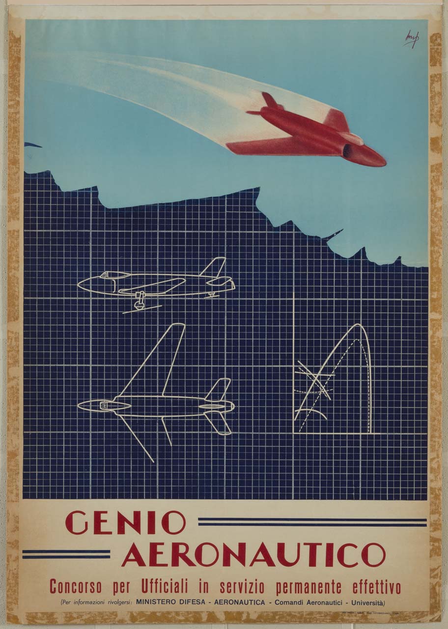 Lettura iconografica: aereo militare; disegni tecnici. Categoria merceologica/ tipo evento: amministrazione pubblica; amministrazione centrale; Ministero della Difesa; concorsi; difesa nazionale; forze armate; aviazione. Nomi: Genio Aeronautico; Concorso per Ufficiali in servizio permanente effettivo; Aeronautica