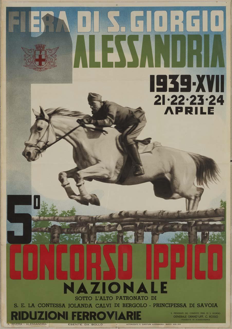Lettura iconografica: cavallo; fantino; corsa a ostacoli; salto. Categoria merceologica/ tipo evento: sport; concorsi; ippica; riduzioni ferroviarie; associazioni culturali. Nomi: Quinto Concorso Ippico Nazionale; Fiera di S. Giorgio; Contessa Jolanda Calvi di Bergolo; Principessa di Savoia; Comitato Fiera di S. Giorgio; Grande Ufficiale C. Rosso; Podestà di Alessandria. Luoghi: Alessandria