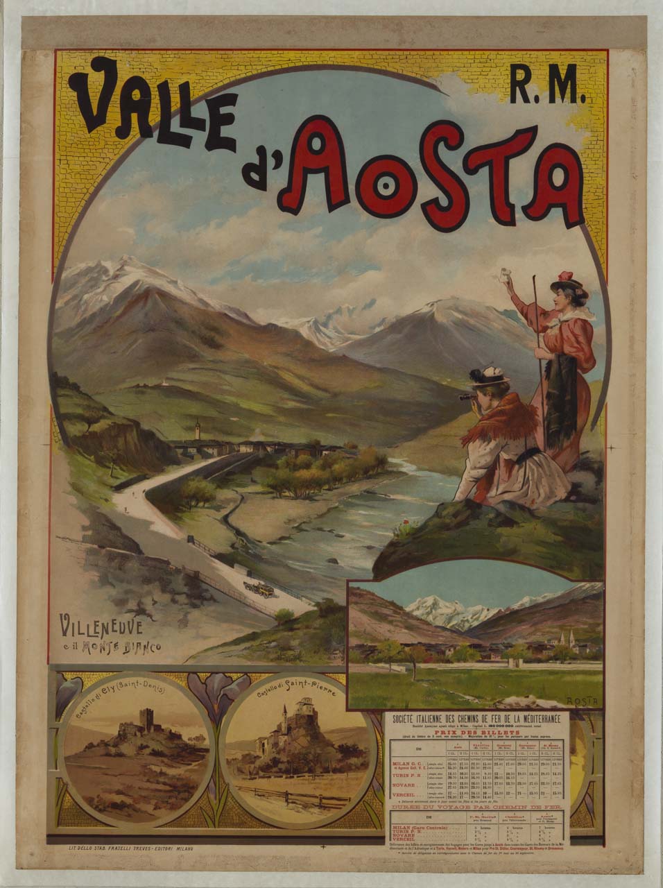 Lettura iconografica: due figure femminili; cannocchiale; bastone da camminata; veduta di città; catena montuosa; monte; architettura medievale; due castelli; architettura romanica; orari; diligenza. Categoria merceologica/ tipo evento: turismo; montagna; trasporti; trasporto terrestre; diligenza; servizio ferroviario; compagnia ferroviaria; rete ferroviaria; treno. Nomi: Società Italiana per le Strade Ferrate del Mediterraneo; R.M.; Rete Mediterranea; Linea Milano-Vercelli; Alpi Graie; Monte Bianco; Tancredi Tibaldi; donjon; De Sancto Petro; Savoia; Challant; ; Pierre Philibert Roncas; Emanuele Bollati; Camillo Boggio; Castello di Cly; Castello di Saint-Pierre; Campanili della Cattedrale di Santa Maria Assunta e San Giovanni Battista. Luoghi: Valle d'Aosta; Villeneuve; Saint-Denis; Saint-Pierre; Aosta; Milano; Torino; Novara; Vercelli