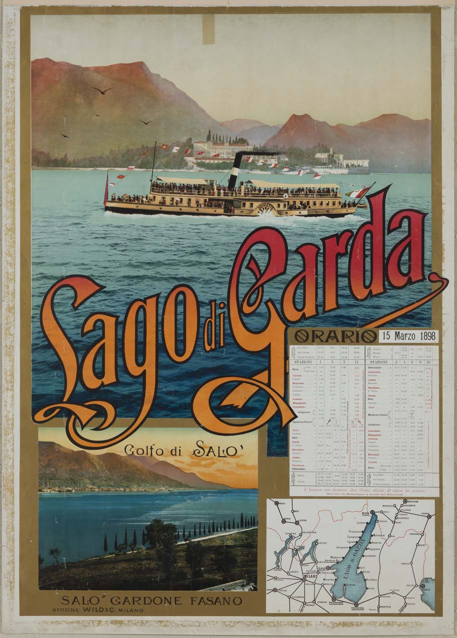 Lettura iconografica: isola; villa; mura; lago; veduta di città; piroscafo; orari; carta geografica. Categoria merceologica/ tipo evento: turismo; lago; trasporti; trasporto per vie d’acqua; compagnia di navigazione; servizio di navigazione; piroscafo. Nomi: Società Anonima per azioni Impresa di Navigazione sul Lago di Garda; Depretis; Luigi Rovelli. Luoghi: Lago di Garda; Isola del Garda; San Felice del Benaco; Salò; Gardone Riviera; Fasano di Gardone Riviera; Sirmione; Riva città; Riva ferrovia; Tremosine; Campione; Tignale; Gargagnano; Bogliaco; Maderno; Fasano; Gardone; Salò; San Felice; Manerba; Desenzano; Peschiera; Brescia; Torbole; Malcesine; Assenza; Magugnano; Castelletto; Torri; San Virgilio; Bardolino; Lazise; Peschiera; Verona; Milano; Arco; Mori; Venezi; Brescia