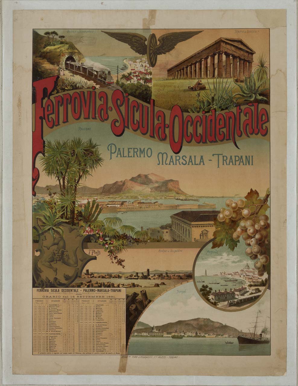 Lettura iconografica: galleria ferroviaria; treno; quattro vedute di città; aree archeologiche; architettura greca; tempio greco; rovine; imbarcazioni; agave; cactus; palme; uva; simbolo; orari. Categoria merceologica/ tipo evento: turismo; mare; trasporti; trasporto terrestre; compagnia ferroviaria; linea ferroviaria; servizio ferroviario; treno. Nomi: Ferrovia Sicula-Occidentale; Linea Palermo-Marsala-Trapani; Tempio di Segesta; Parco archeologico di Segesta; Parco archeologico di Selinunte; Triscele. Luoghi: Sicilia; Segesta; Calatafimi Segesta; Selinunte; Castelvetrano; Marsala; Trapani; Sferracavallo; Palermo; Marsala